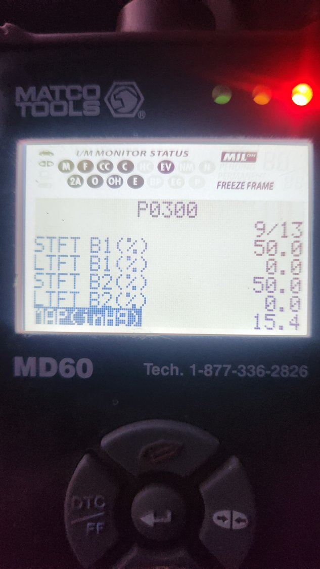 I was able to check fuel pressure today and got a new code as well. Key on while pump primes 62psi. When pump stops priming holds about 60 psi.Turn key back off, 58psi holds for over 10 minutes no noticeable change after 10 minutes. 56 psi while running. I drove it down the road and the check engine light started flashing. It was like driving down a bumpy road felt it in the whole vehicle lol. I got back home and read the code again and got p0155 bank 2 sensor 1 Could an oxygen sensor be causing all this mess? Fuel pressure doesn't seem to be the "issue". The freeze frame shows the misfire problem starting while the fuel system is in closed loop. No freeze frame data for the o2 sensor code.