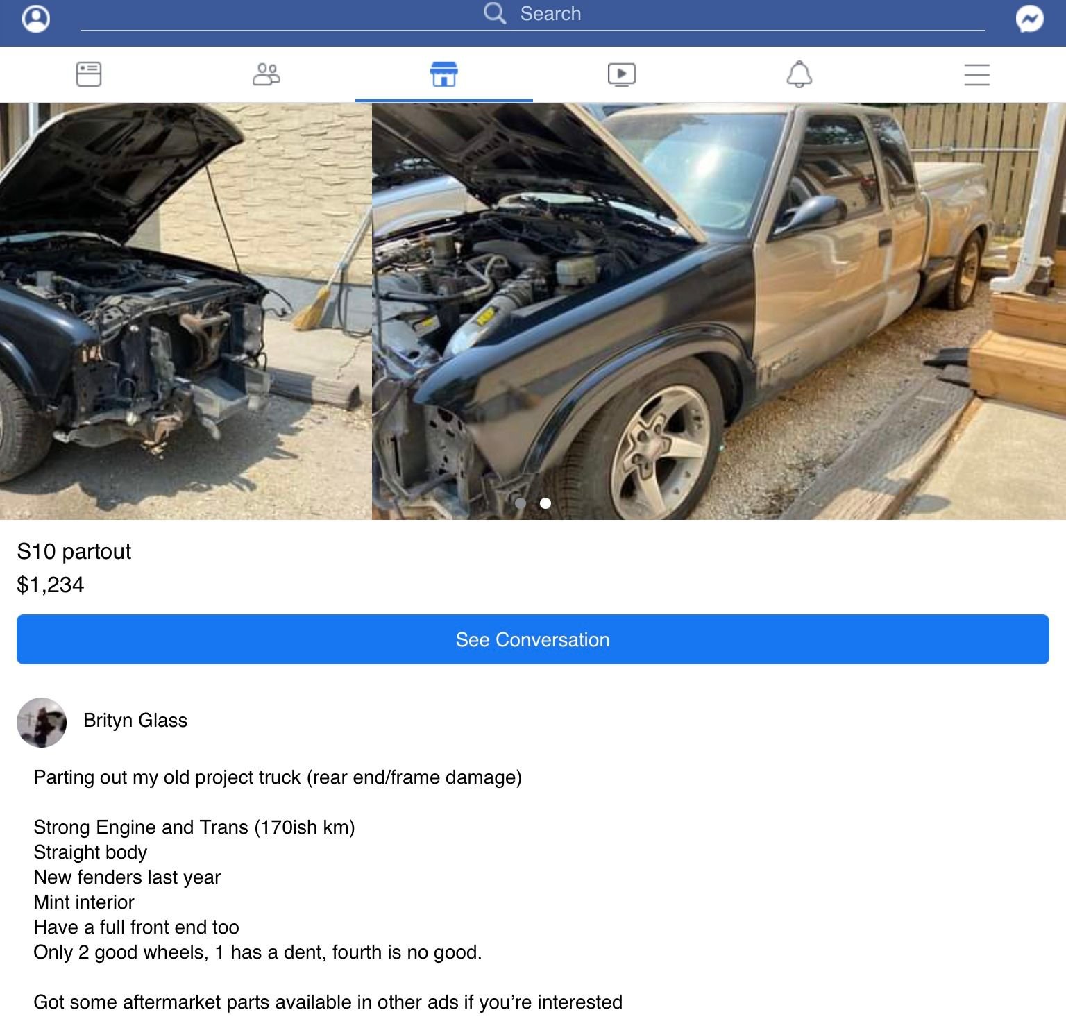 This is the 2003 S10 I found near me. What I need is to replace my drivers side fender from my 2005 Jimmy.