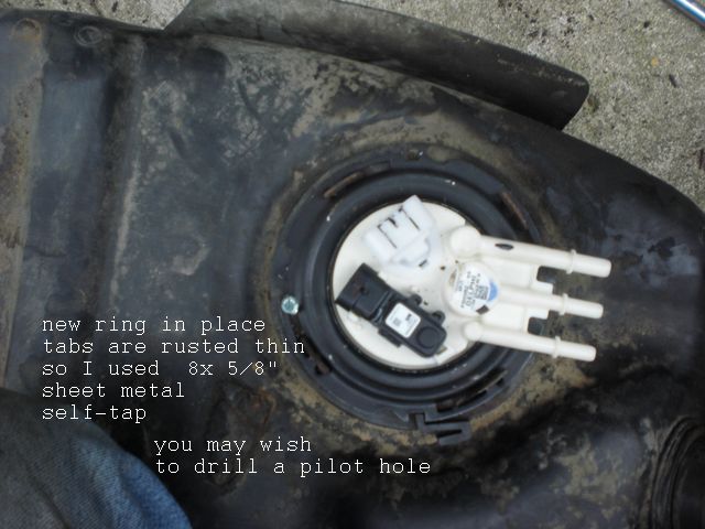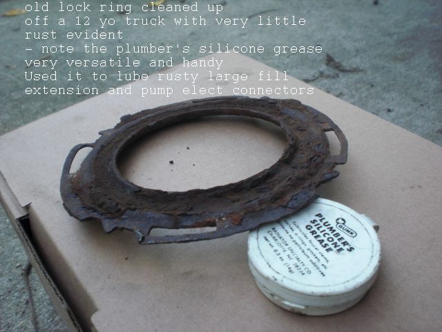 At any rate,now I had the tank out, I saw the pump was the original. The lock ring was nothing but a cluster of rust. So another trip. Checked the parts stores, they dont have either the ACDelco {P/n TR 14} or the Dorman equiv.
