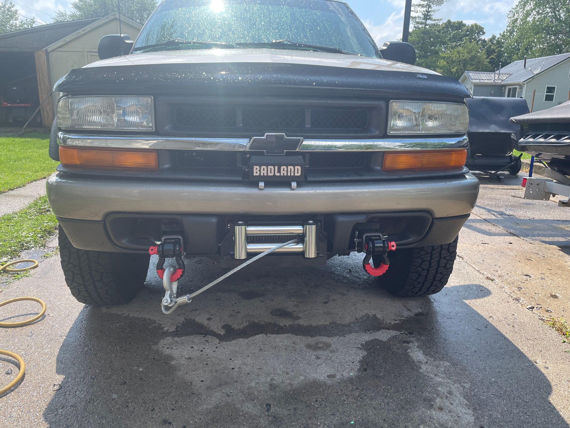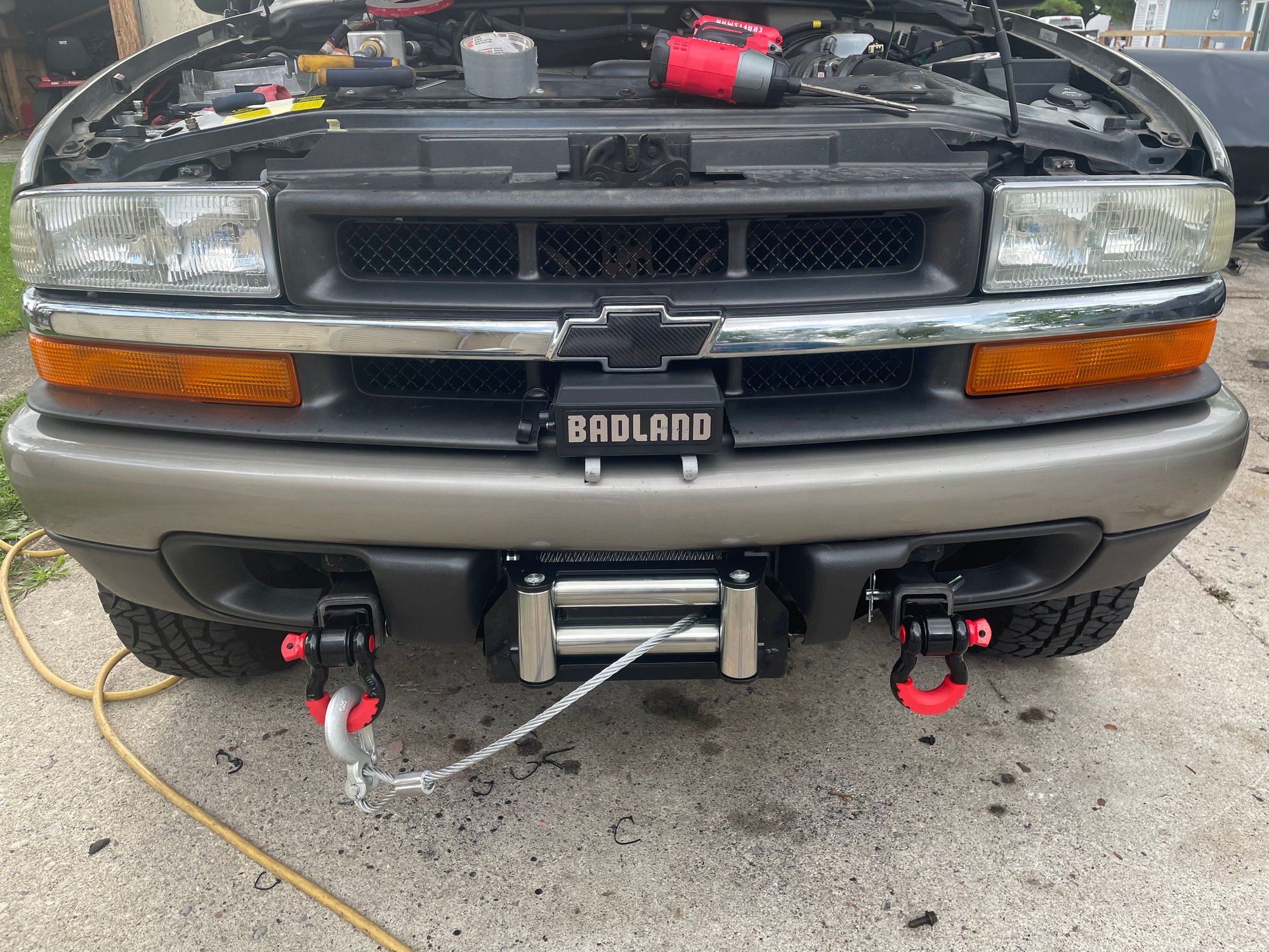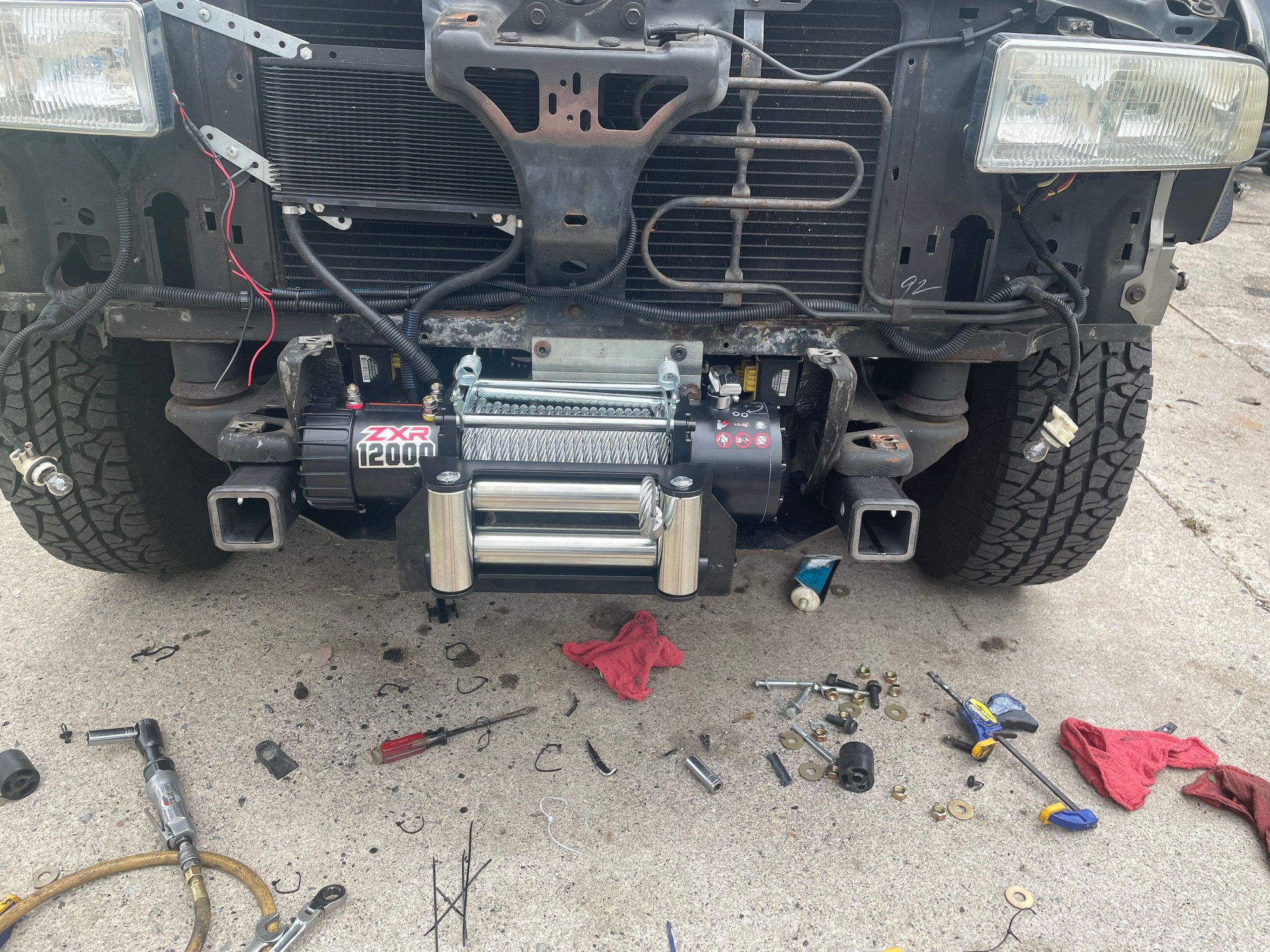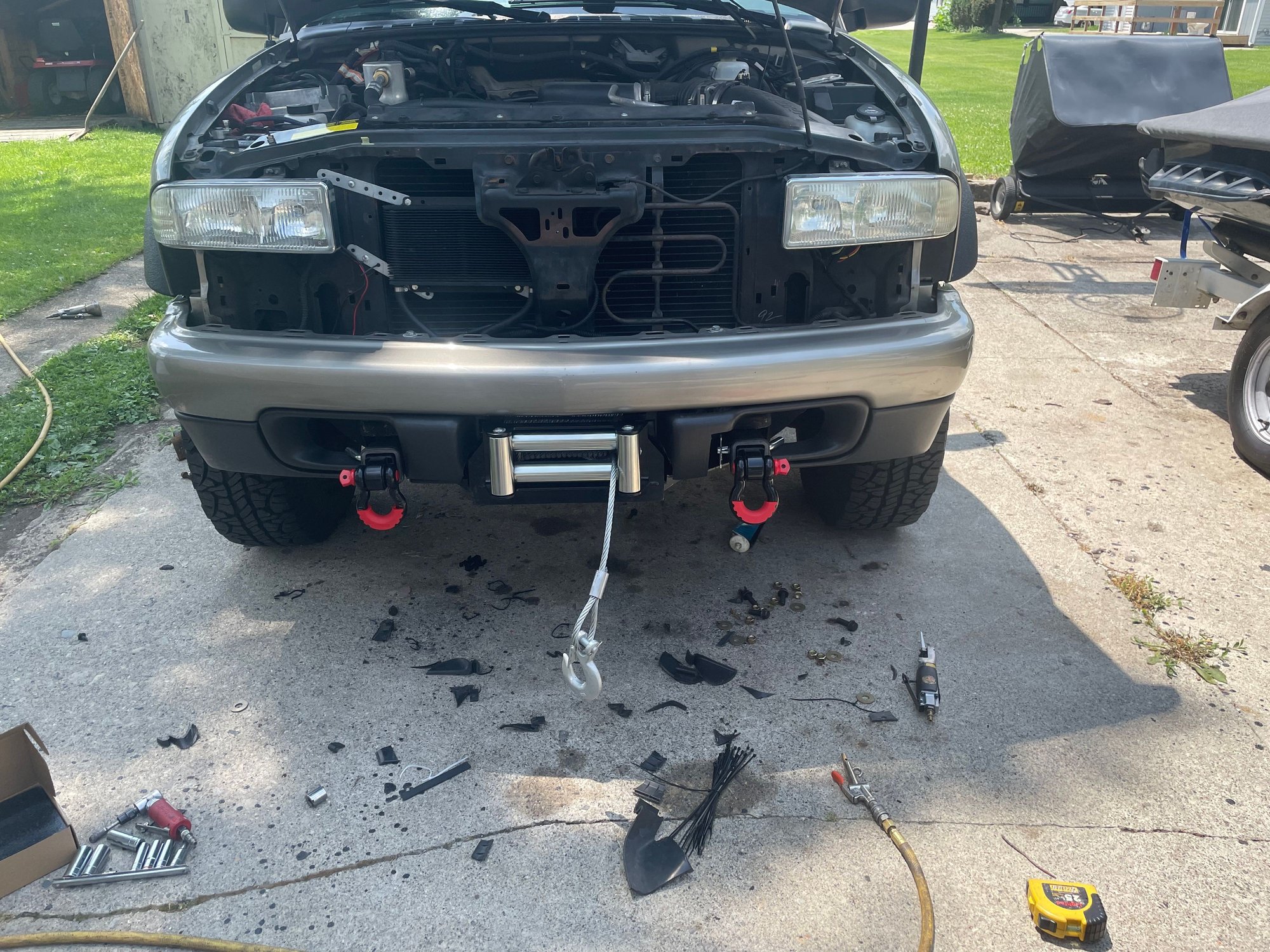 Just installed this winch plate with 12k winch. Went on my truck not the blazer. But install would be the same. Lots of pics Cut the grill around the control box Finished Cut out around drivers side shackle to make room to reach into the winch lever