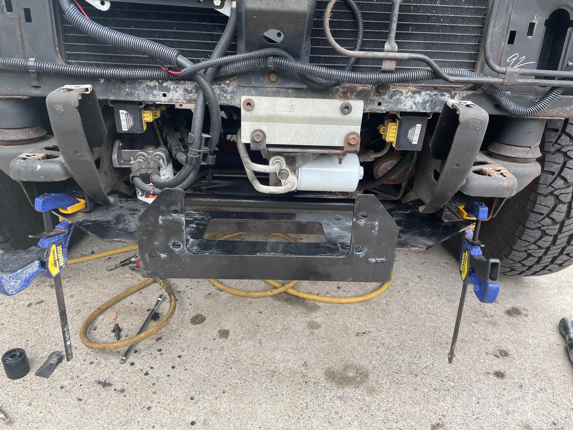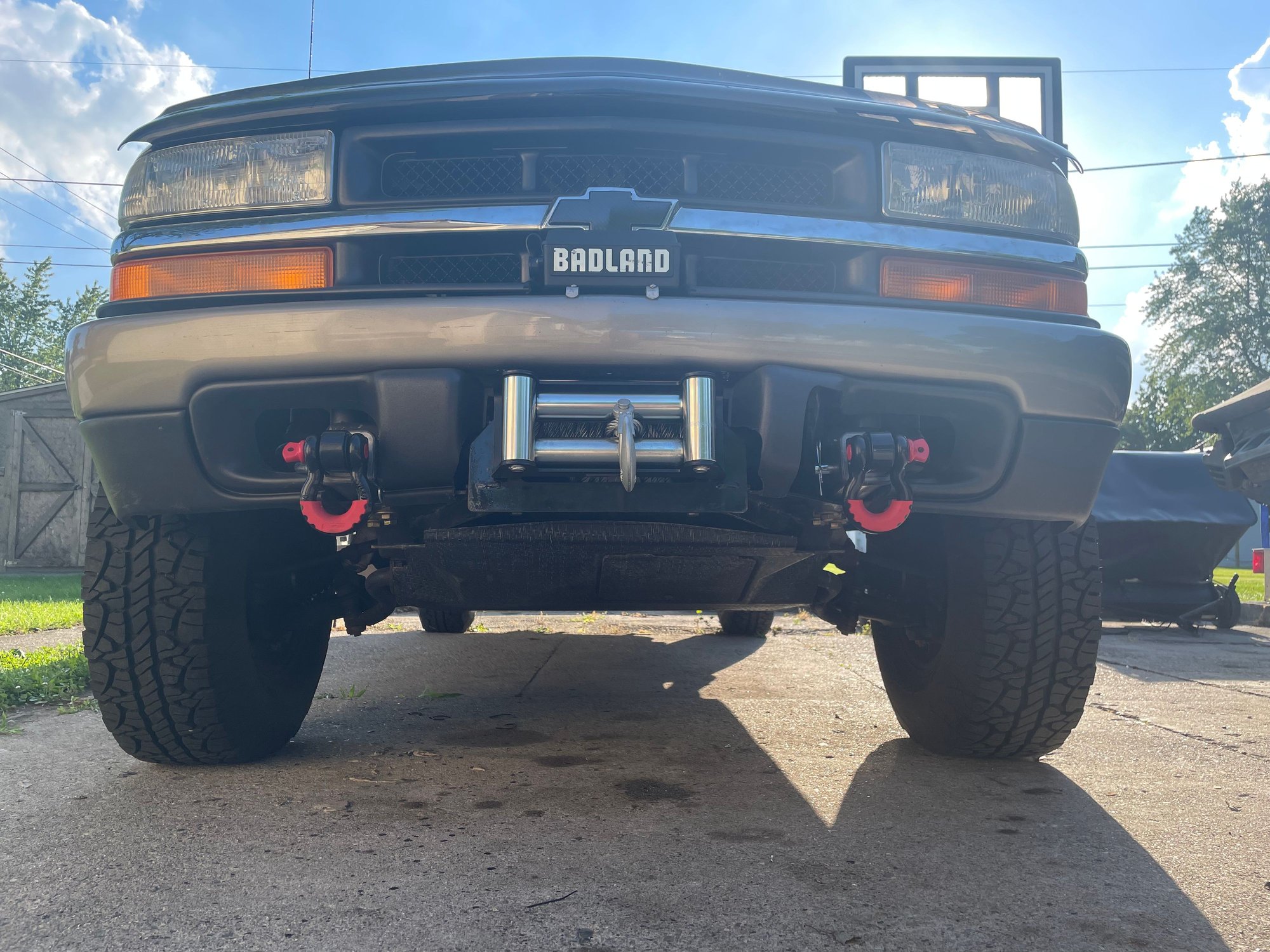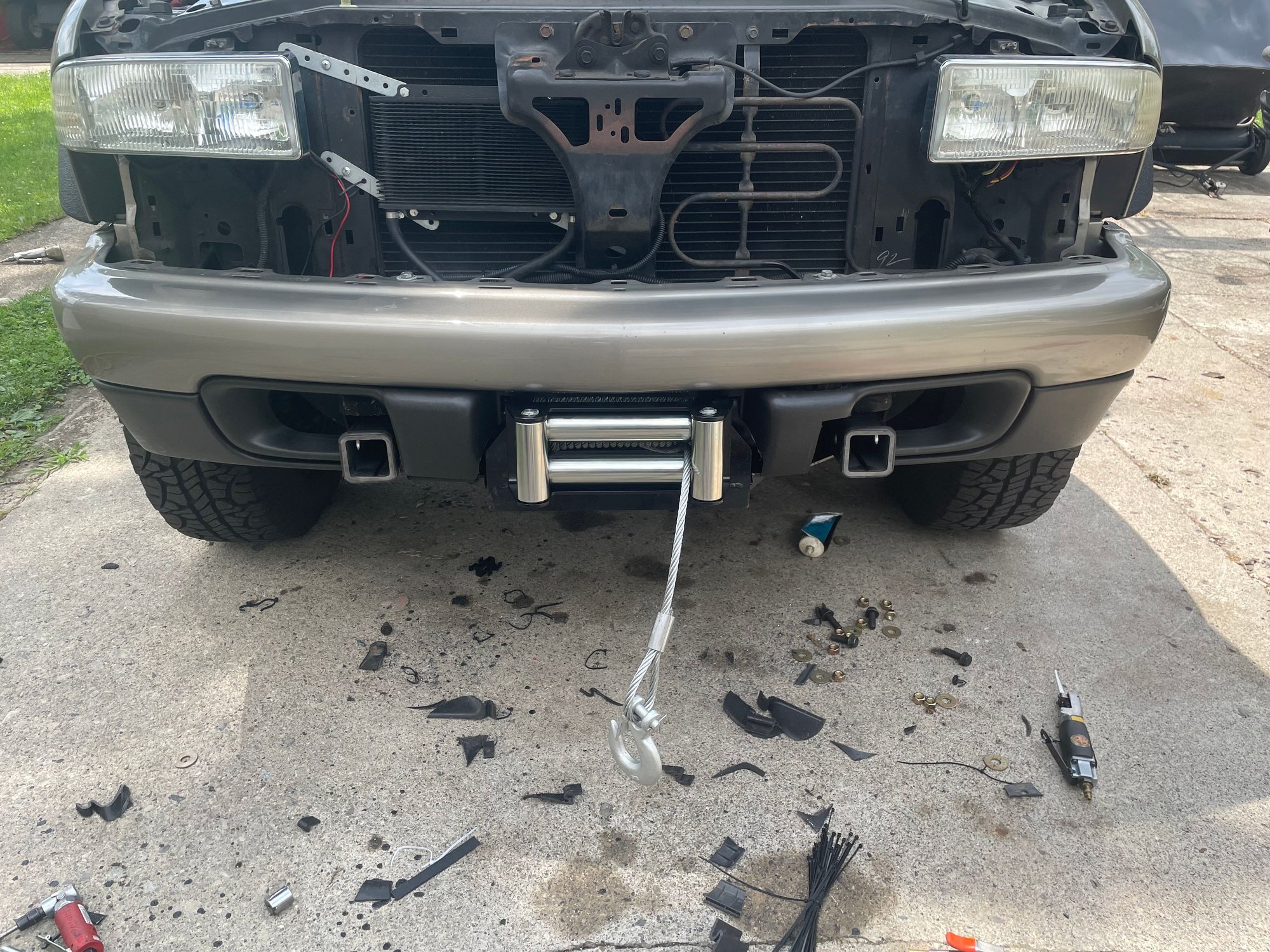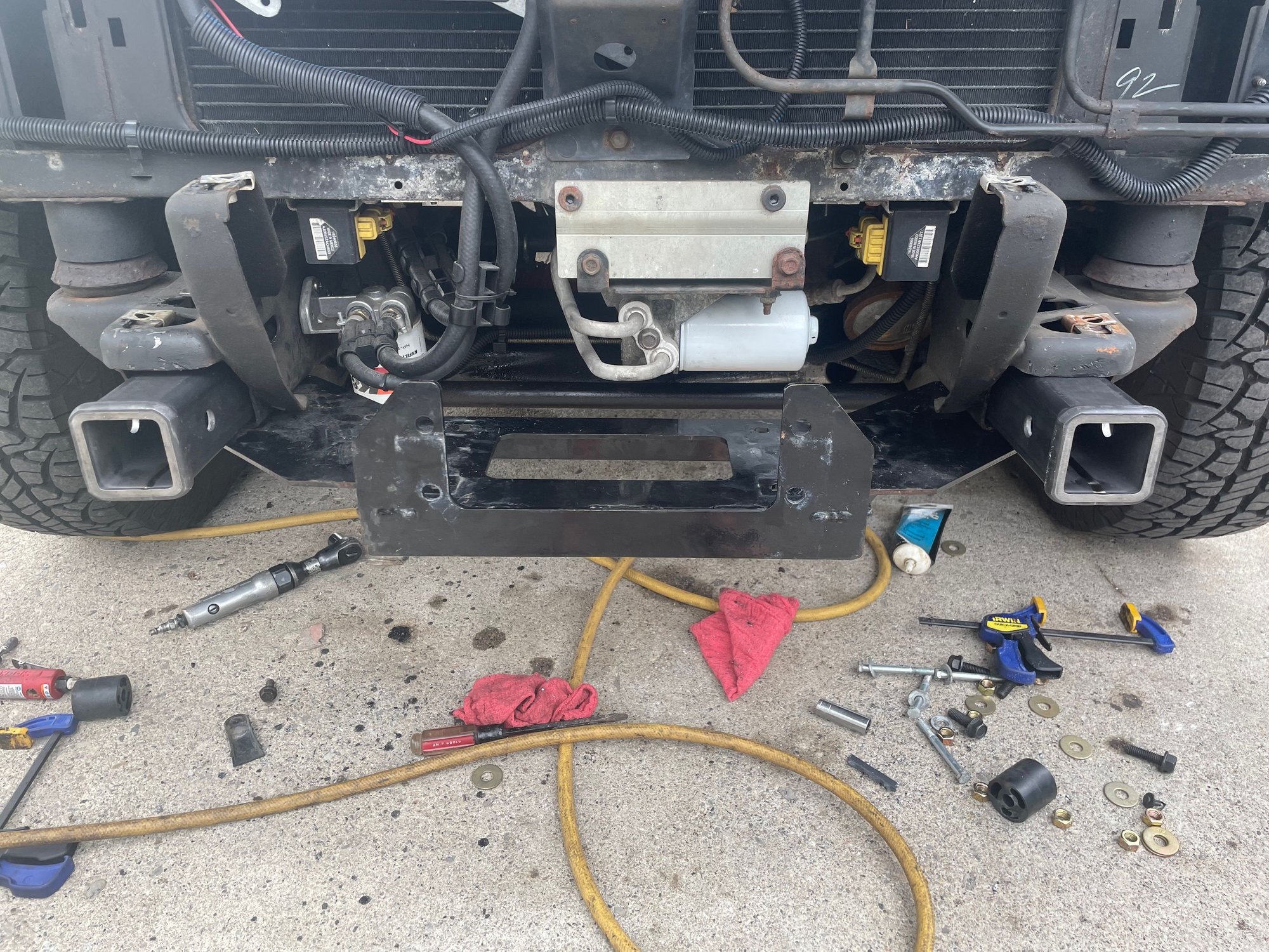 Just installed this winch plate with 12k winch. Went on my truck not the blazer. But install would be the same. Lots of pics Cut the grill around the control box Finished Cut out around drivers side shackle to make room to reach into the winch lever