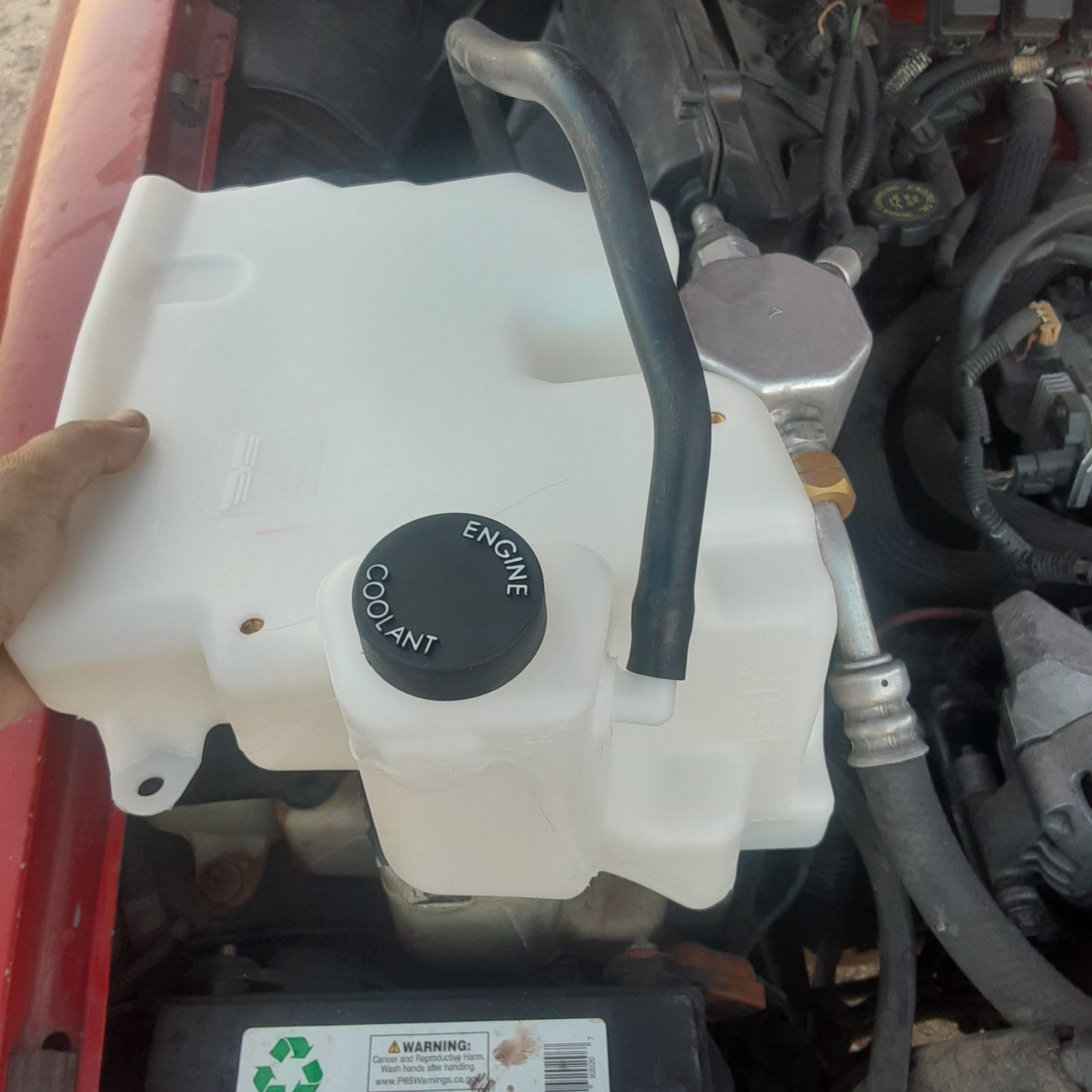 however they had the coolant reservoir tank and radiator apparently a little rigged, as when I looked at first glance, was night by this time I could tell the reservoir tank was going to need replacement. OK so the coolant reservoir has 2 places to connect hoses, an upper and a lower. Originally I was unaware the upper hose spout was broken off. The lower spout hose ran right into the radiator next to the radiator cap. I got the new reservoir and am now unsure where the upper hose goes to. I ran the lower hose back the same way they had it... so if anyone out there can PLEASE PLEEEEAASEE show me some pictures of the routes the 2 hoses go, and where they lead into.. I would be incredibly grateful. This was old crusty coolant tank, and im not sure if u can tell where the upper hose 'spout' has been broken off. The new tank, i had not seated it yet when this picture was taken.. but it seems to clearly be pointing out the upperhose does have its role ro play.