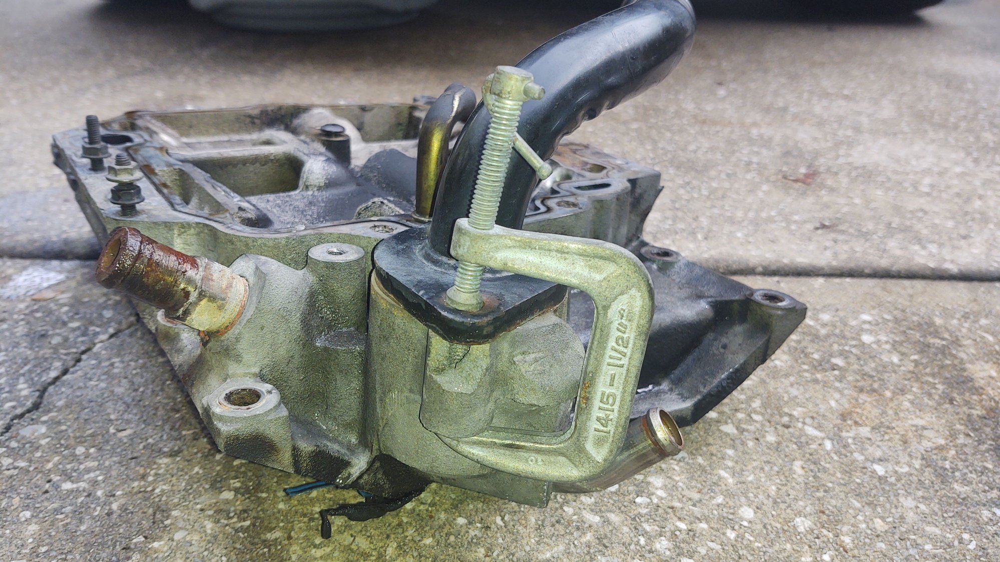 Can see my trusty 'ol faithful C-clamp that's held the thermostat housing together since the last time I changed the thermostat and the lower intake cracked at the forward most mounting location, that was about 4 or 4 1/2 years ago. Never leaked a drop there lol