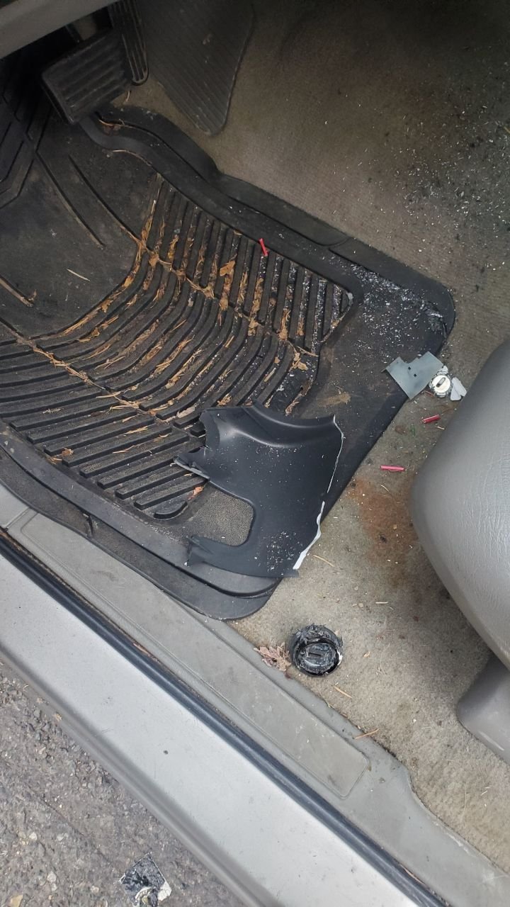 I park on the street outside my apartment, and there's been a LOT of vandalism and theft recently. Two nights ago, after I'd gone to the car wash to flush my heater core to try to get some heat blowing (was only getting cold air, now it's just warm) someone tried steal my baby. [see pics] She came with an alarm, but I'm pretty sure I forgot to lock her up, and they got in. Lord knows what the hayl they thought they were doing, but they royally screwed my ignition, destroyed the wires underneath, and generally left me stranded. (I have AAA, and I'm going to tow her to my buddy's.) They also absconded with my new toolbag (+ impact driver, new ratcheting wrench set, and OH YEAH.. my HAYNES REPAIR MANUAL! The jerks!)