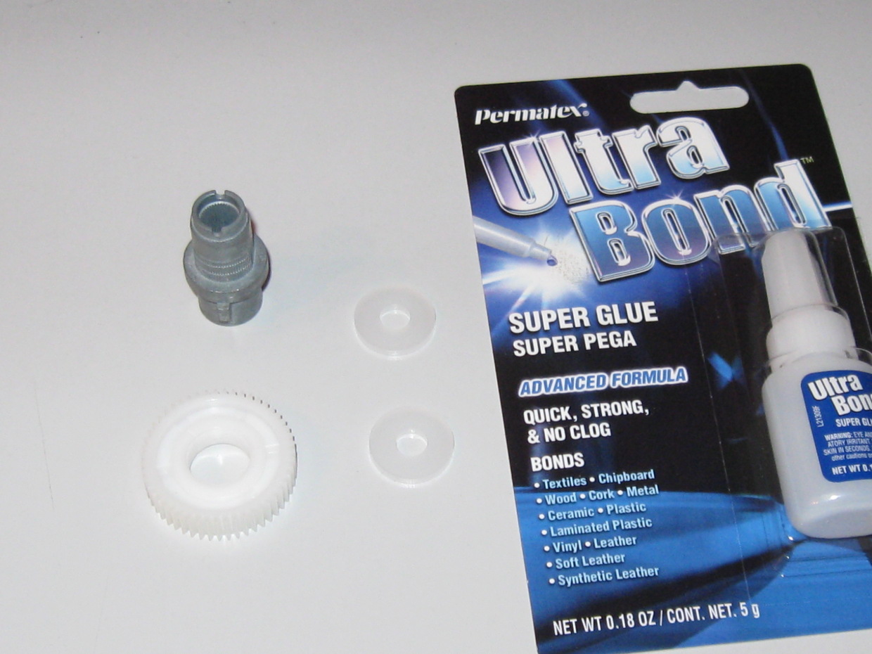 Then, give the gear re-inforcement, with a nylon washer on each side, and superglue each one.