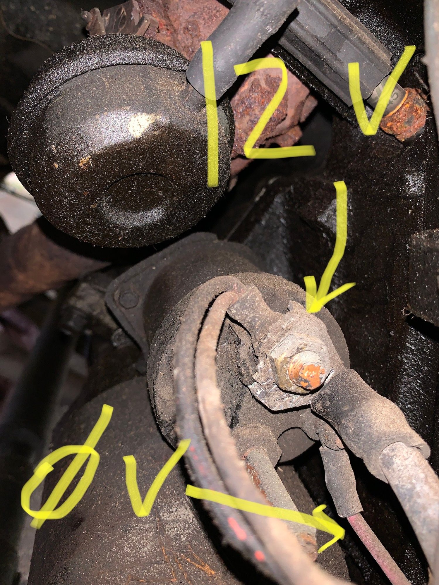 I found a few more electrical diagrams for trucks of your vintage. These show that the main power cable for the starter and its attached solenoid is black and then on that same large stud is 1 or 2 red or rust colored wire(s) that heads up to the firewall (as in your first posts). Then on the small solenoid stud on the starter assembly there is a purple wire to energize the starter from the ignition switch. So you have no purple wire on the starter assembly just a black and red? The red is on the small solenoid stud or on the same large stud with the black starter power wire? The solenoid that you measured is the solenoid mounted on the starter or a solenoid in the engine compartment/fire wall?