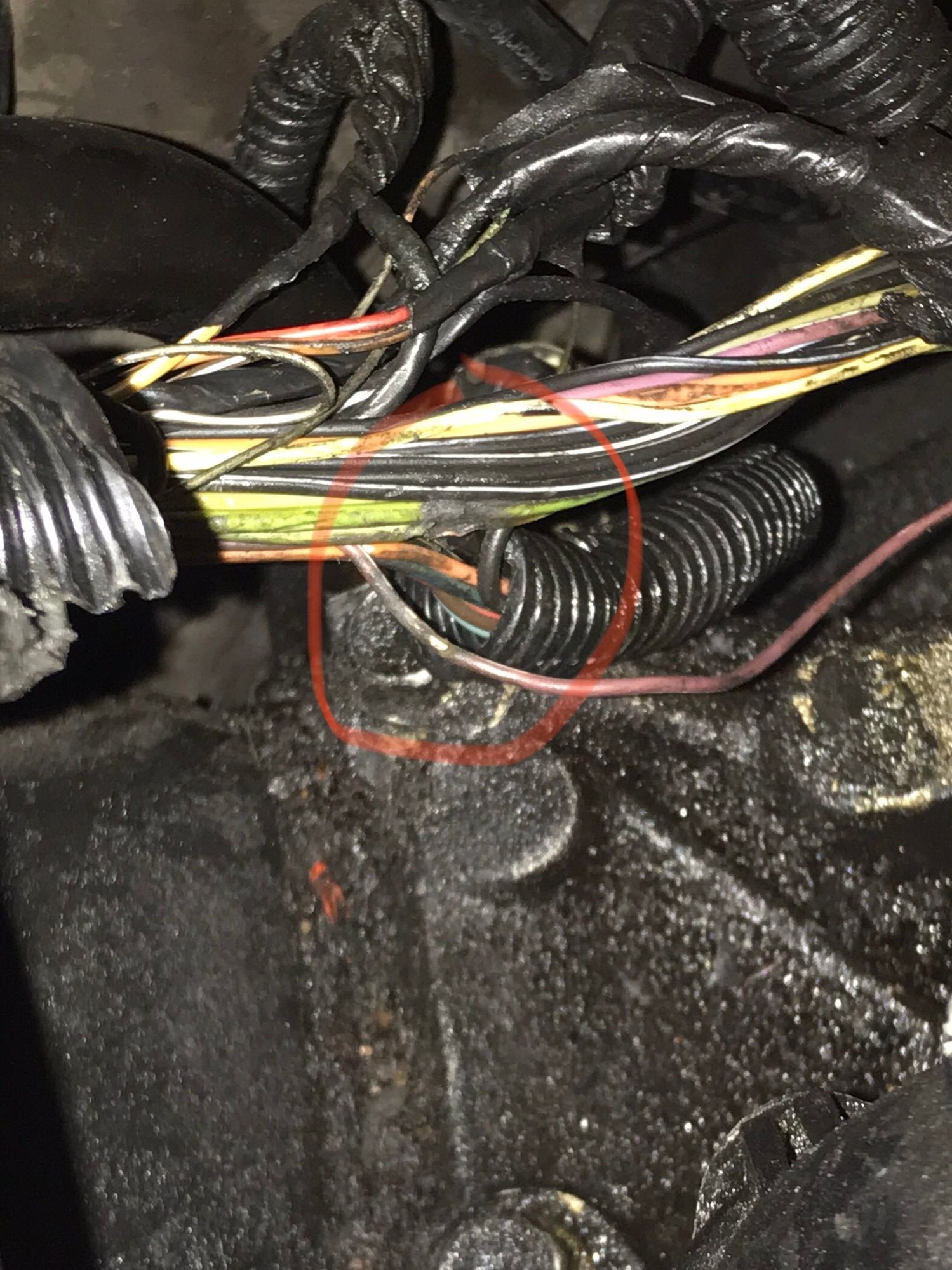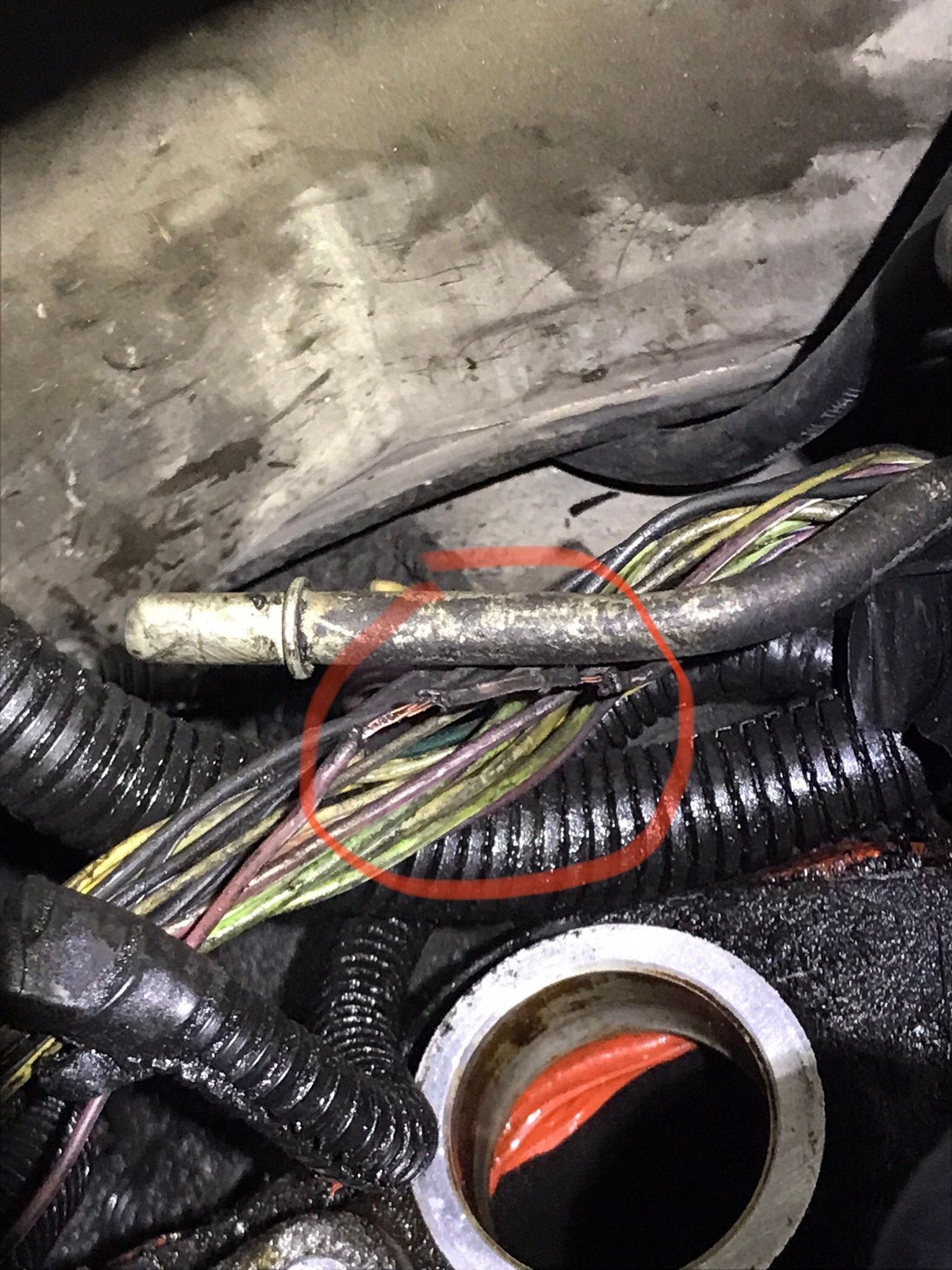 Did some borescoping and found what looked like a chaffed harness to the passenger side of the distributor. Moved some stuff and peeled the harness back to find this under the oil pressure sensor