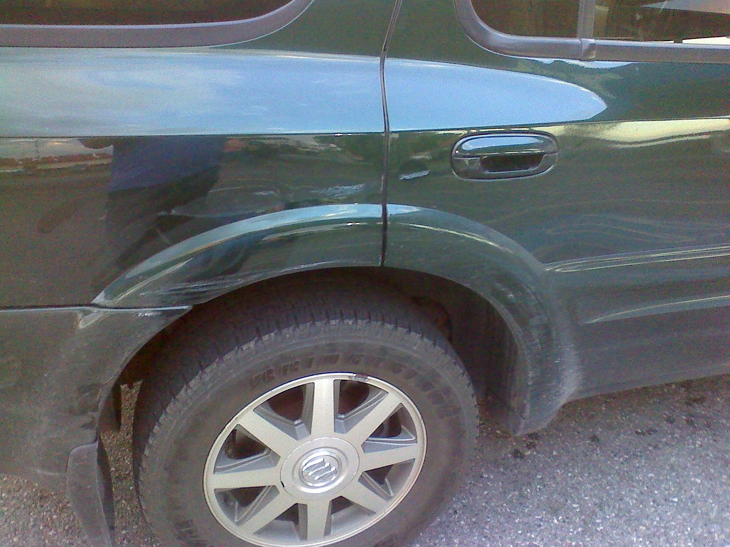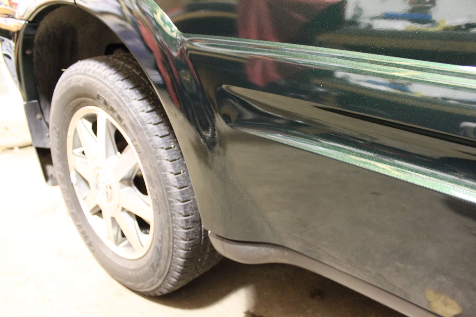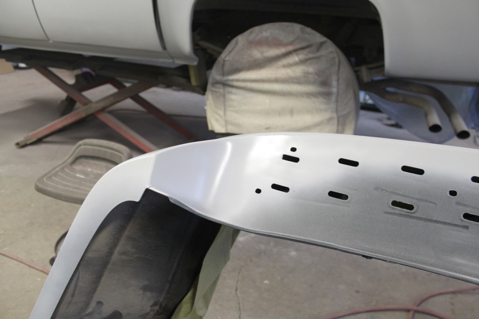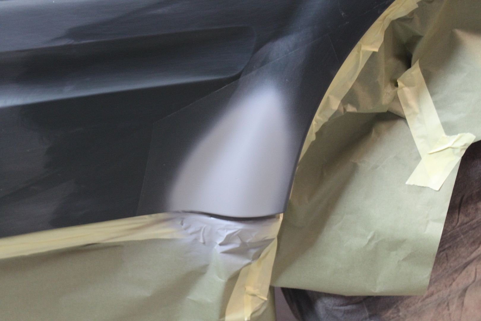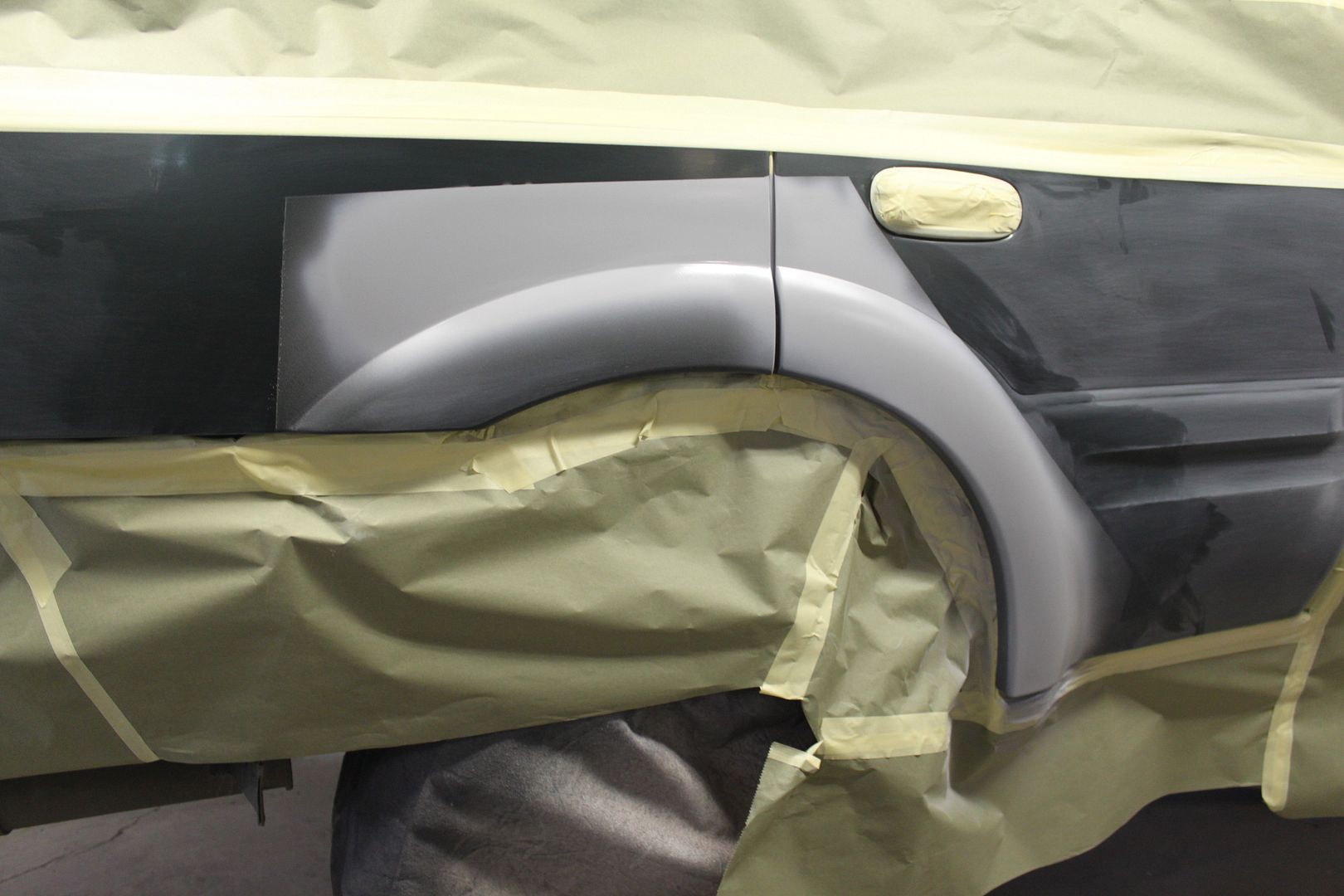 I decided to repair some other damage that was on the bumper from when we bought it. Since we were painting the cladding on the passenger side due to the scratches/scuffs, I wanted to repair the road rash typical on these. We put down some rock guard paint on the flared out section on both rear doors to protect it then painted over it with color and clear.