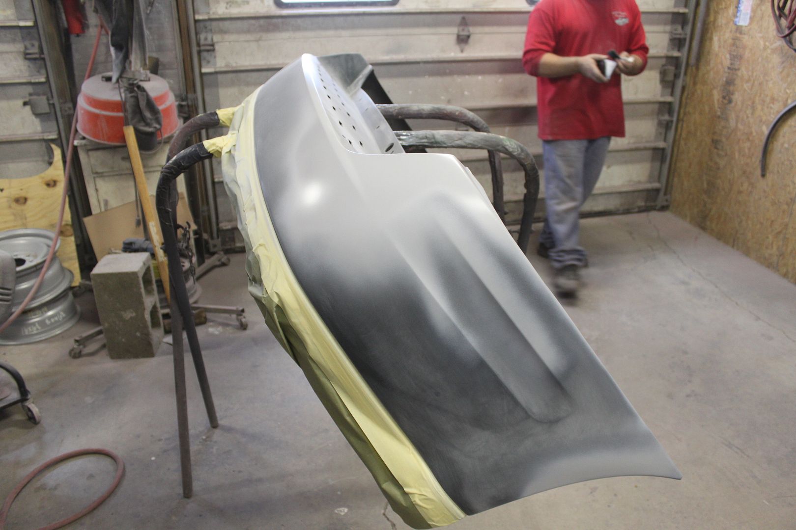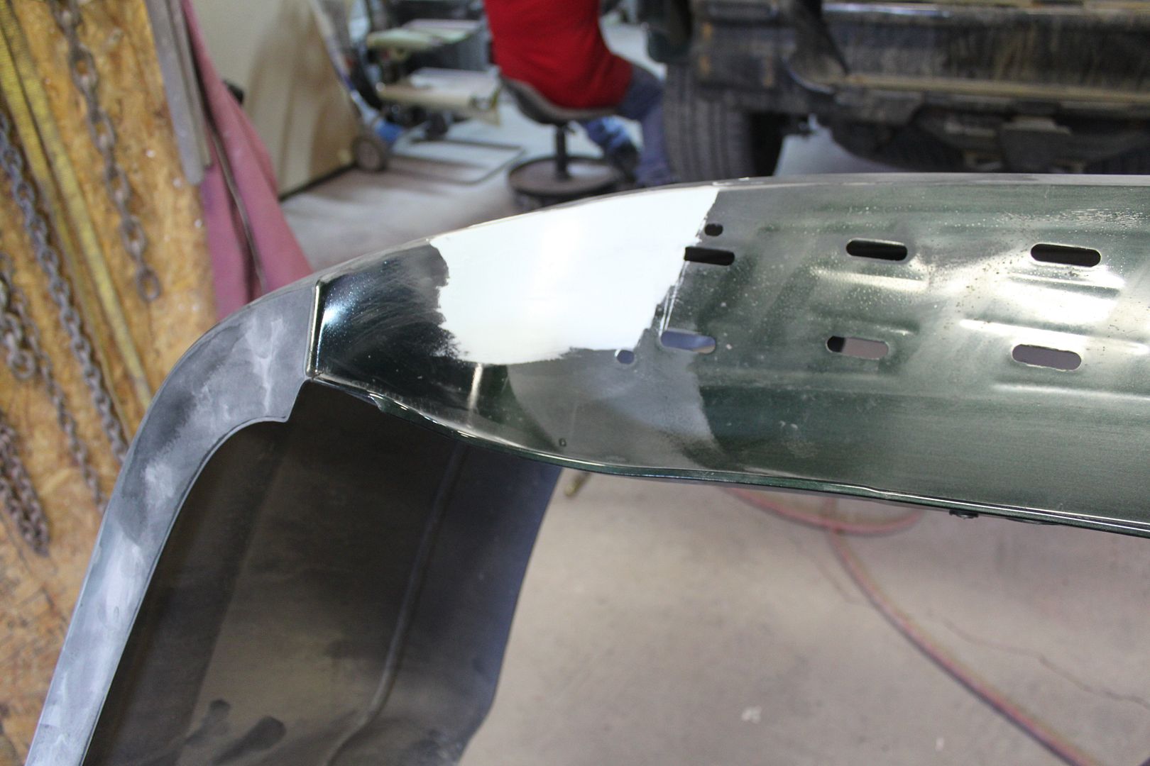The first four images show the repair to damage that was present when we purchased the truck. It was initially covered up with a parking lot repair job and it always has bothered me. The last two show the primer on the other repairs.
