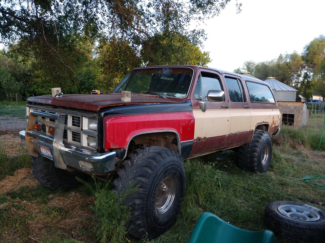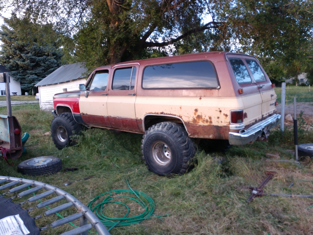 While I work on funds to fix my Jimmy, I decided to see how my 44" ground hawgs fit the suburban. The burban gave up its 35s to the Jimmy and has been sitting on blocks. The guys at work had bets going that I couldn't even bolt the 44s on the burban with only 6"s of lift. Well they fit with some minor trimming. I need to lift it another 2-4" and do some creative trimming to be able to actually drive it.