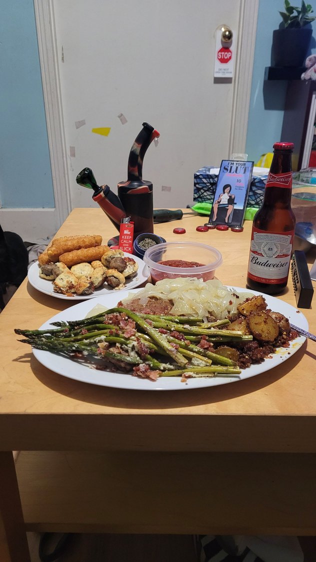 Edit: should say it was med-rare sirloin steak/ roasted potatoes with herbs and bacon/fried asparagus with parmesan and bacon, with a side of jalapeños Cheddar sticks and mushroom caps with a salsa dip.