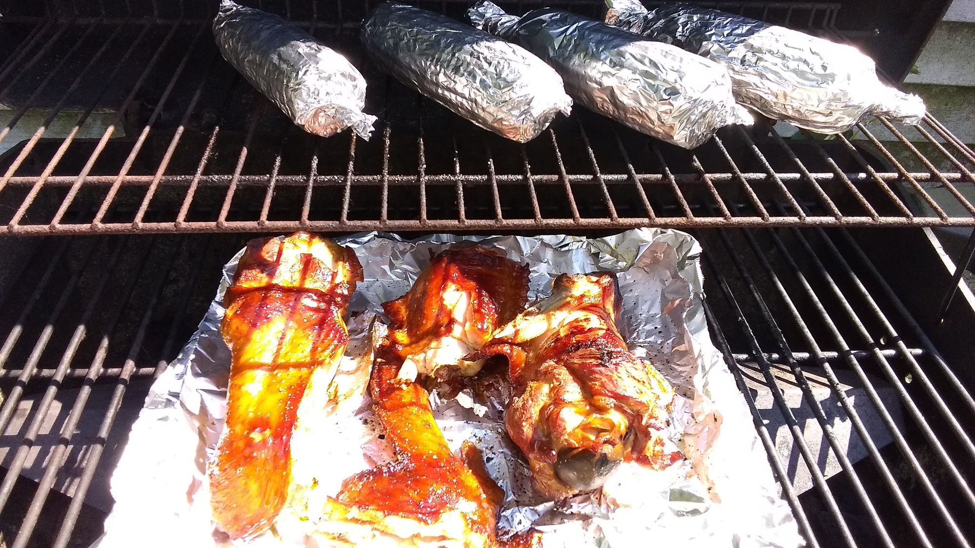 the roommate and I are enjoying pre smoked turkey wings, corn on the cob and mac and cheese. we didn't Grill last night so a day late and a belly full.