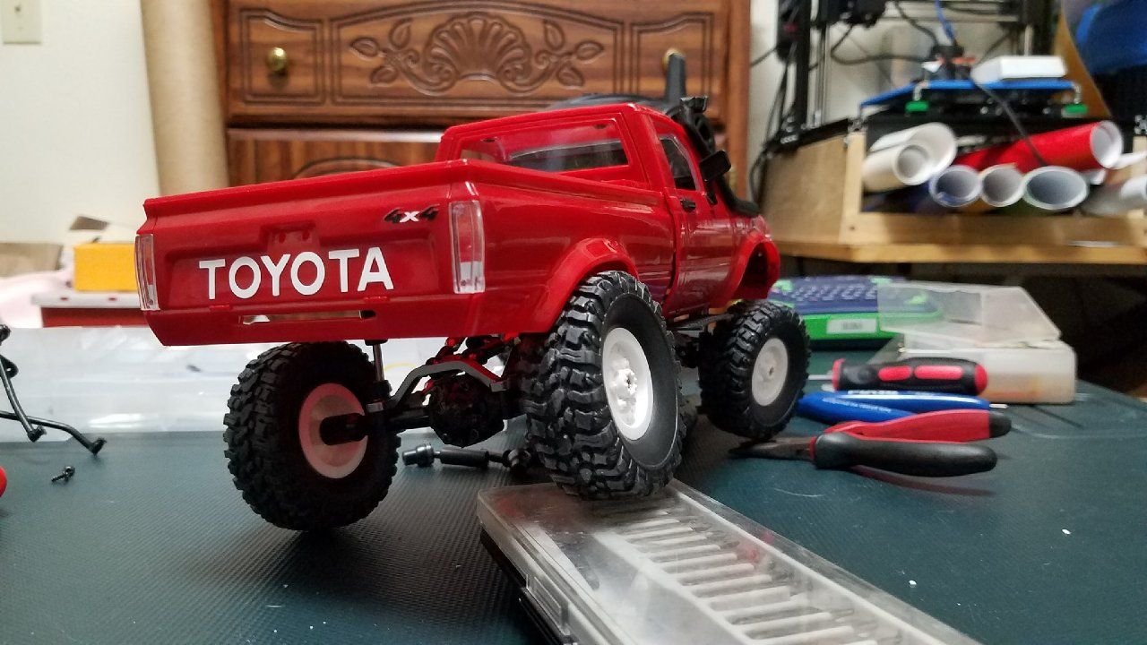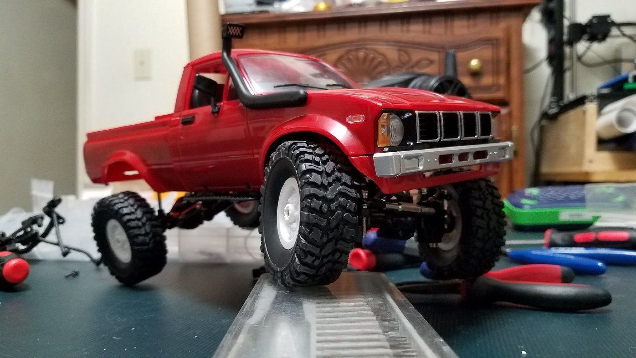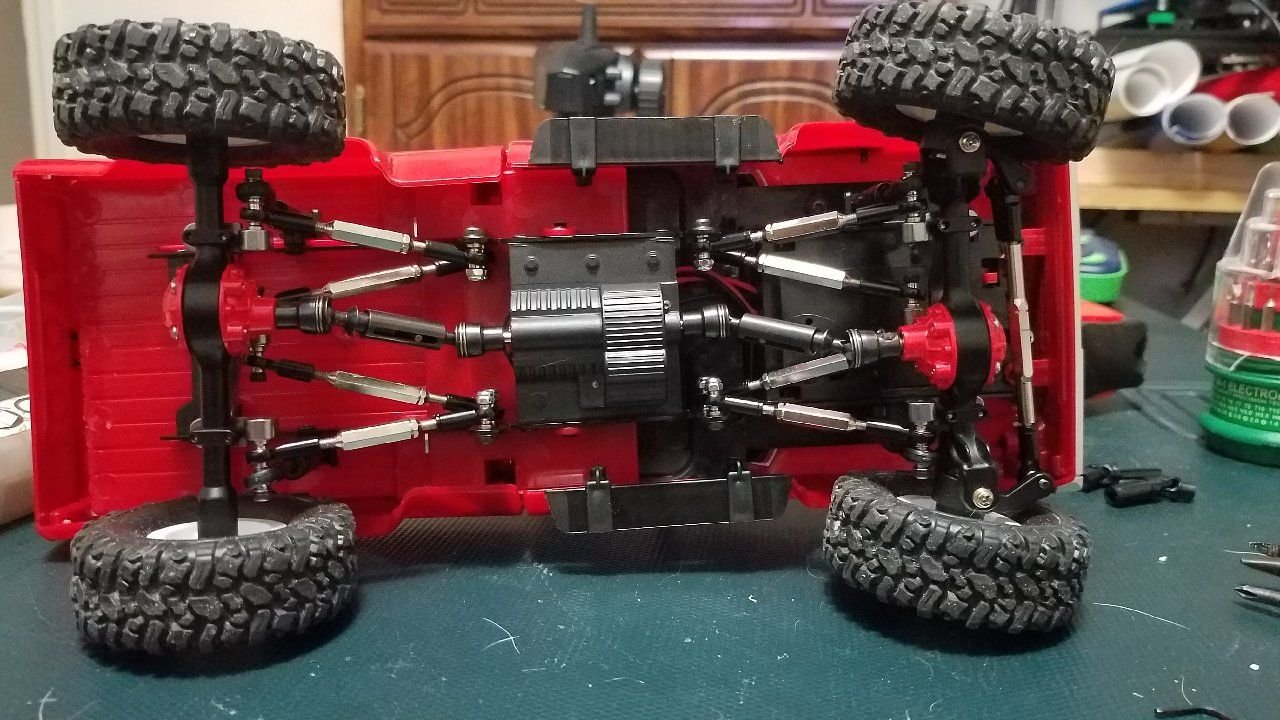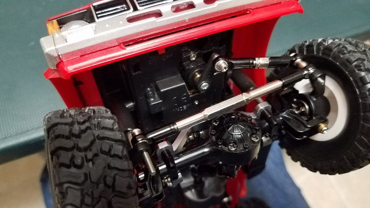 Well, for starters, do NOT get the RTR version... Leaves a lot to be desired. The kit version starts you off with proportional steering from a regular servo, a little bit larger motor, and better tires from the get-go. The steering on the RTR is a complete joke, and the first thing I did was rip it out and toss in my own electronics with a metal gear servo, Spektrum RX/TX system, and I have a little bit larger motor that should be here soon, as well as some softer tires. I've got it actually moving finally! Ended up installing a poorly made gear into the rear diff which was causing a ton of binding. After playing with some shims to get the ring and pinion mess good, it spins pretty good now. But I also just got in metal axle housings to replace the plastic ones, not just for strength, but also to shift the weight lower. Between the metal axle housings, metal gears in them, metal drive shafts, and the metal 4 links, I've probably doubled it's weight lol, which is good because it's all down low. Along with the softer tires, I have some aluminum wheels on the way too, and that should add just that much more weight down low