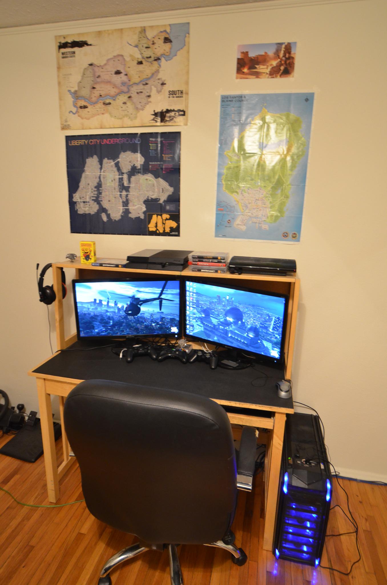 The monitor on the right is hooked to the ps3 and my PC with a HDMI switch, so when I am recording game play, I can turn that monitor to the ps3 and have the one on the left to monitor the recording, or the live stream.