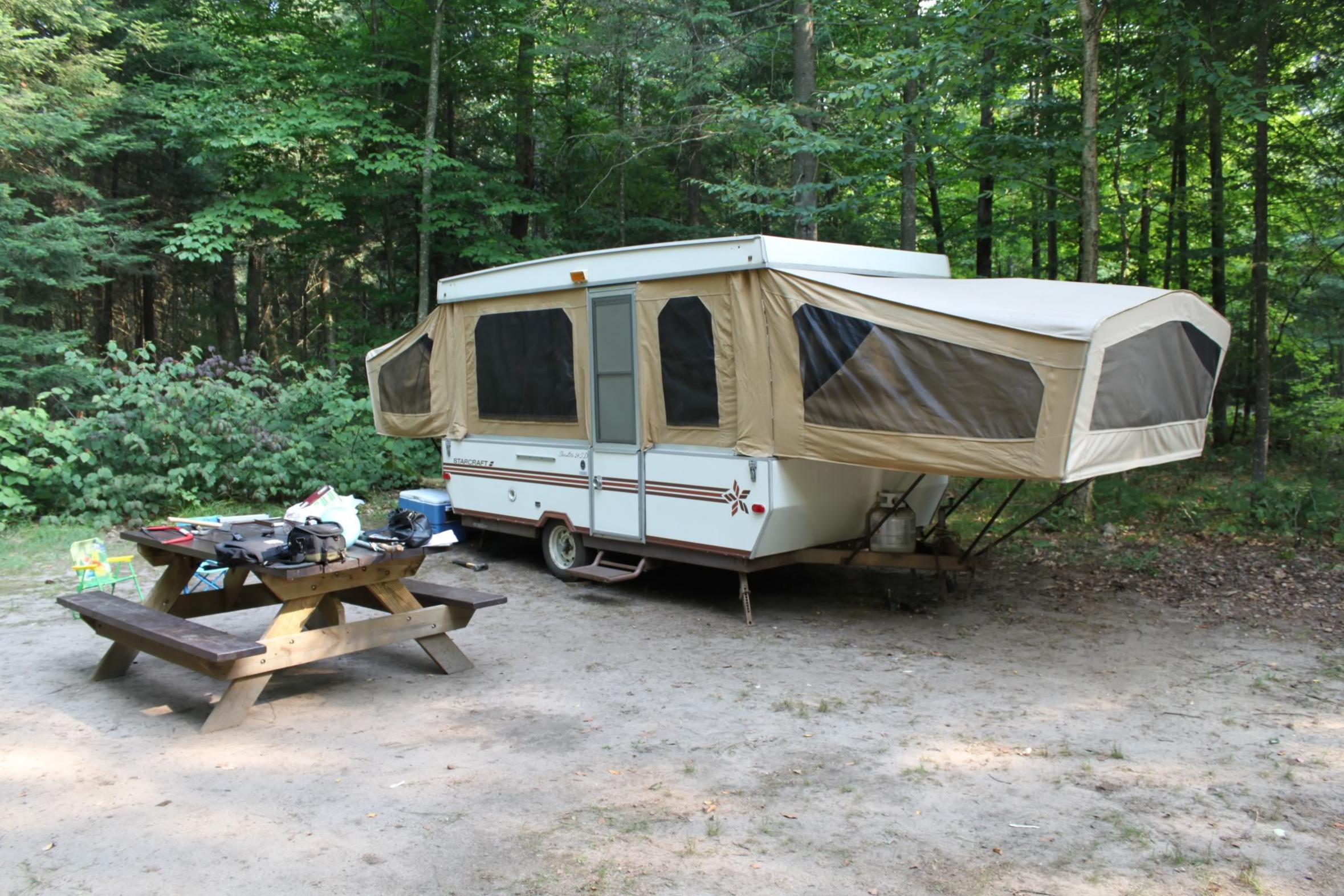 Sleeps 6 like the pop-up, but was much easier to setup. Less than 20 minutes from park to awning/beds out.