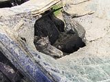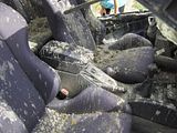 the apprentice just got bumps/bruises, and a few lacerations (mostly to his upper body and right arm). considering the hole in the passenger's side of the widshied, i'd say he got off pretty lucky!