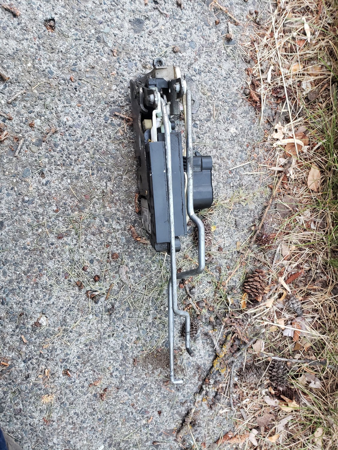 Driver's side lock mechanism removed from my truck showing correct connections to it of two of the linkages. This image has the bottom of the door lock mechanism at the top and the face that is at the door outer door wall that engages the striker is on the left.
