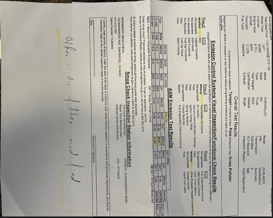 I recently purchased a 77 K5 Blazer from Oregon and had it shipped to NorCal. I had a 71 K5 right out of high school but couldn't afford to keep her. Was inspired to find another K5 and my goal is to learn to work on her as a hobby (small to medium jobs as I learn and save the big stuff for a local pro). Recently failed smog test miserably. According to the results the PCV was modified, Thermostatic Air Clear is missing, Air filter was modified (Edelbrock). Cats not applicable but I'm not clear if California emission standards will mean I have to have Cats installed on her?