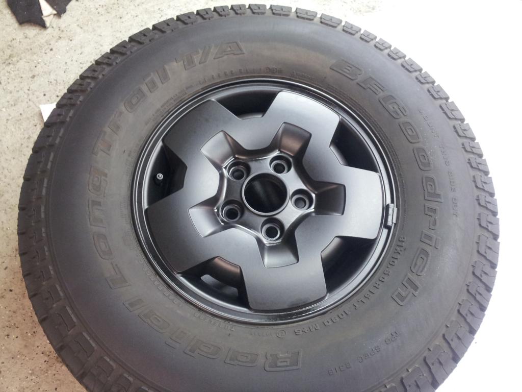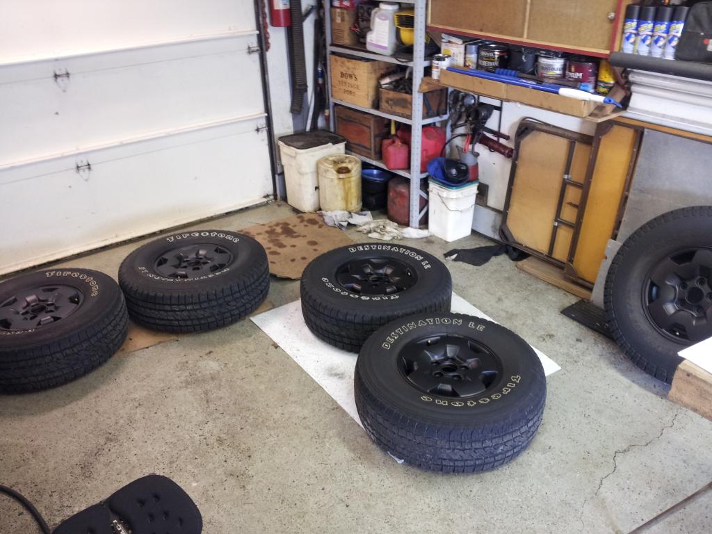 Its pretty straight forward. I put on 3 coats total, 1 light coat and 2 heavy coats. When the plastidip is still wet, it will sort of look like a wrinkle finish but as it dries, it seems to level/smooth out pretty good. The spare tire on my Blazer already had the plastidip on it but I peeled it off when I did the other 4 so they all can have a fresh coat. And yes, it did peel off pretty easily so if you mess up, its easy to peel and retry.