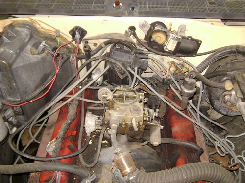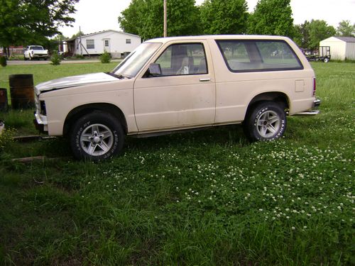 This is pretty ugly. Pics may scare people. I bought this from an auction. It was a former Florida government vehicle, it still has the coax and some wiring left over from the lights and other equipment. The first time I owned the Blazer it had a 4 cylinder and an auto. After 3 months of use the engine died. My nieghbor had just wrecked his 93 Blazer with a Vortec V-6. I bought the wrecked Blazer and started the swap. My other neighbor wanted it more than me and bought it. It sat in his field for a year when yet another neighbor bought it. He swapped in the V-8 from another wrecked S-10 Blazer and let it sit. A week ago he approached me about buying it back. I turned him down at first but decided I really wanted it back. I had to sell the parts van I bought to fix my wife's Astro but I got my V-8 Blazer. I was told that it had a 350 and a t400 trans. When I swapped the intake, I discovered I had an older block, I ran the numbers and found out I had a 283 from about 1965. Looking at the trans I knew from the Astros I have owned that I had a 700r4, possibly the stock V-6 trans.