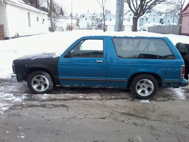 Here is the truck I'm getting this week sometime. 1990 2dr 4.3 auto Blazer static dropped, tint, basically a whole new front end because of an accident. I figure it's a good platform, especially considering that I have a cammed 350 just laying around. Bags are in the near future and I want to get the small amount of typical rocker/wheel well rust fixed asap. Pics of truck as it sits...