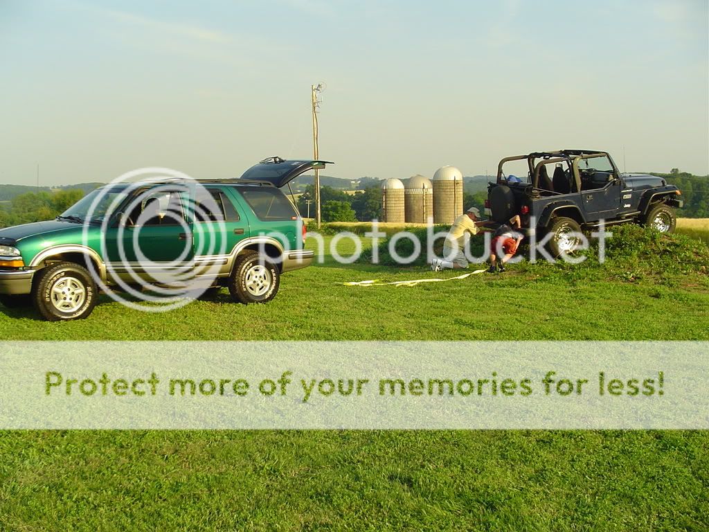 Just as the title states. My Blazer pulling out my old Jeep (now owned by my Uncle). He thought he would have enough clearance to crawl....NOPE!