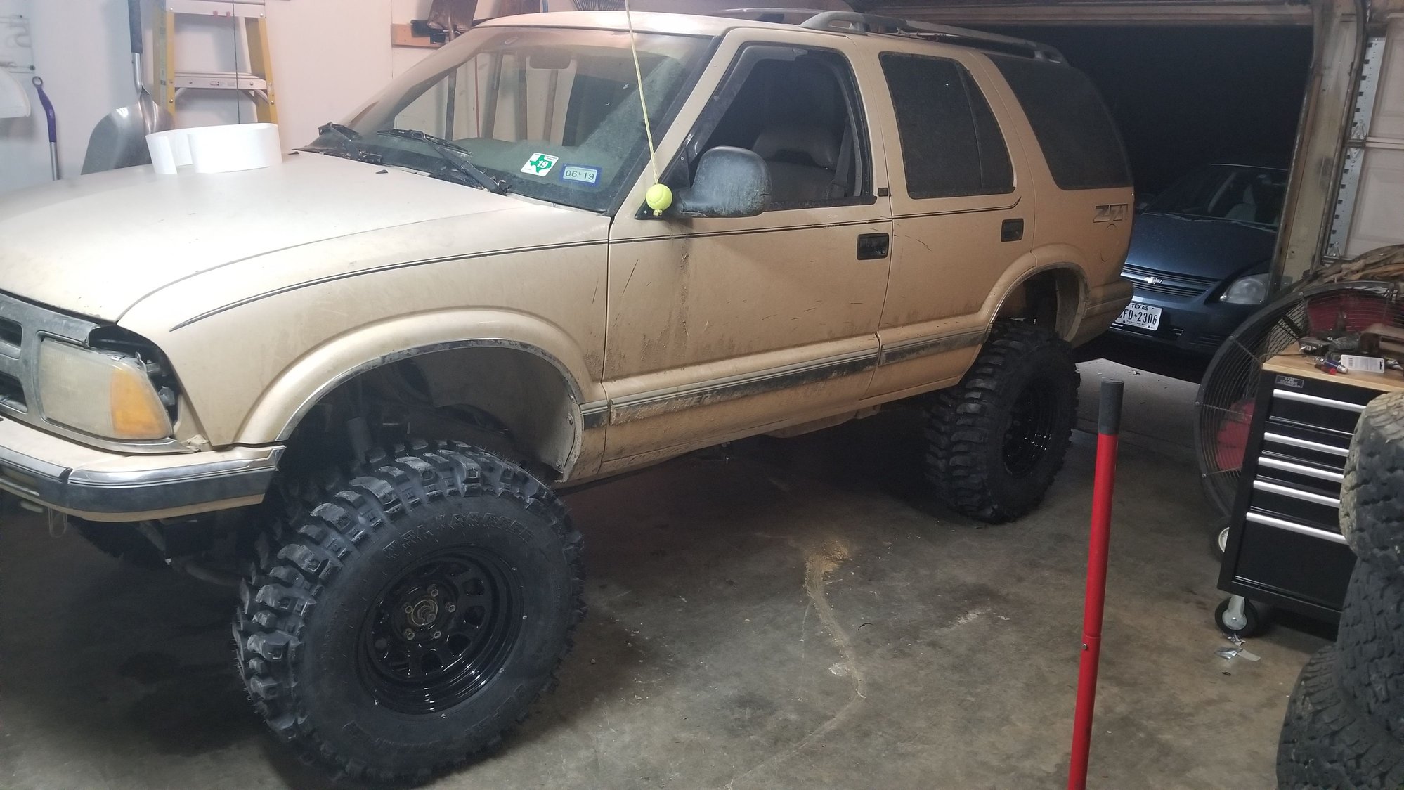 I really like the way that combo looks. I'm going to try and fit the same combo on my 96 Jimmy, probably won't go with boggers due to the price. I've got keys, shackles and a 2" bl right now. I've still have to install my aal. I know I'll have to do some serious trimming on the front fenders. I may end up just going 32x11.50