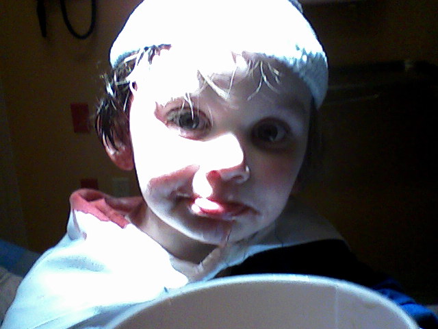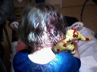 yeah she's a trooper. took 8 staples to the nugget. 3 with out flinching, 2 more saying "ow" and the last 3 demanding a "poscle". needless to say, she mopped up with 2 popsicles