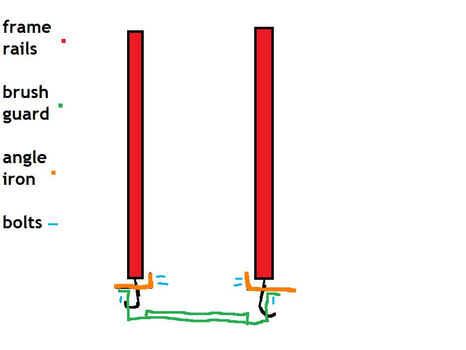 get angle iron. with the set up you have there, go to the front of your frame rails, mount the angle iron on the inside of the rail capping the frame rails OVER the tow hook mounts
