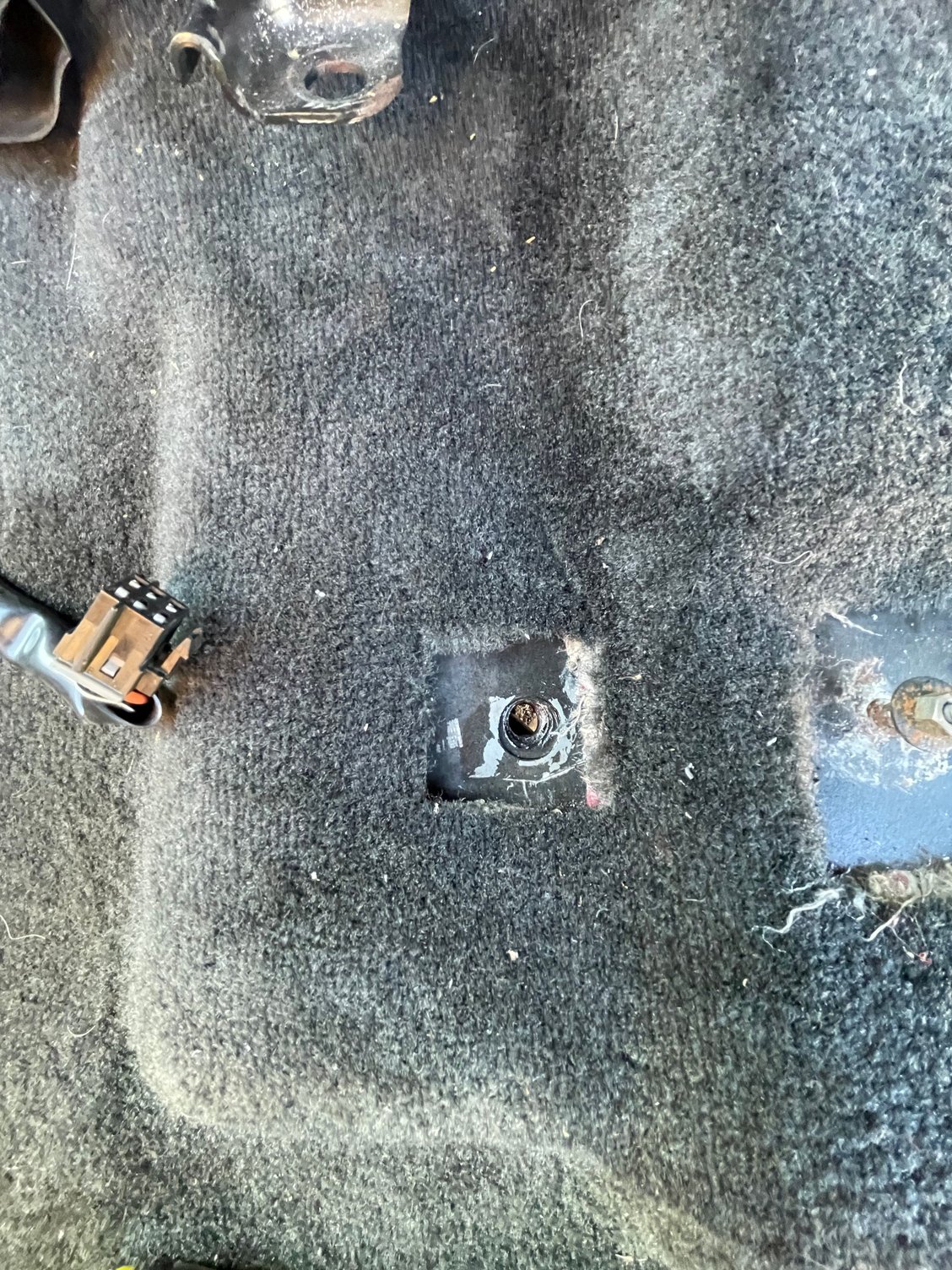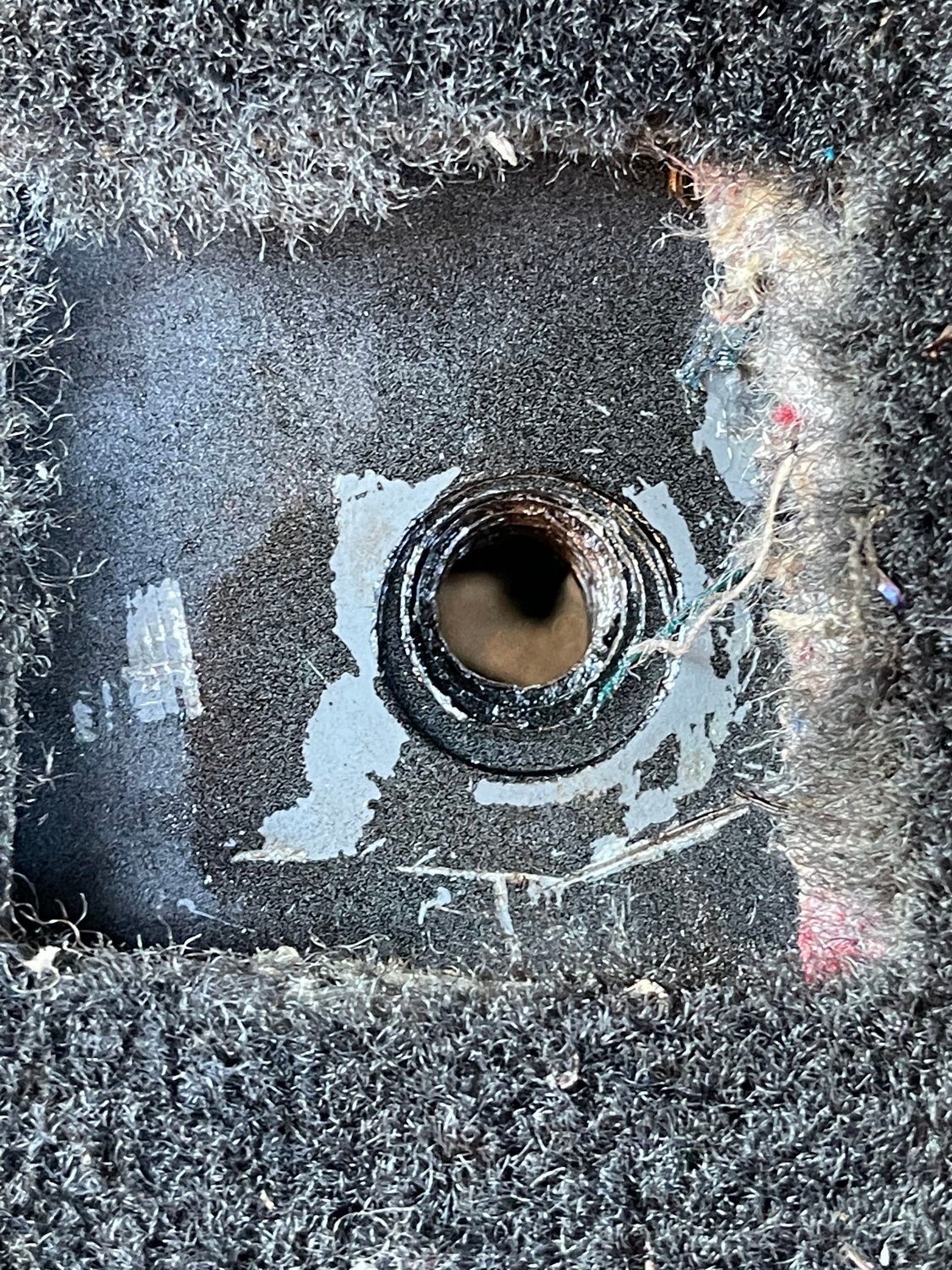 Once the seat is out of the way you’ll need a half in drill bit. Again, drill as straight as possible going down and have your shop vac and water within reach. The passengers side appears to bottom out in to a chamber so it’s not as much of a concern but the drivers side GOES THROUGH so be careful if you’re drilling through the old bolt. Personally I drilled through with my 3/8ths bit first and followed with my 1/2”.