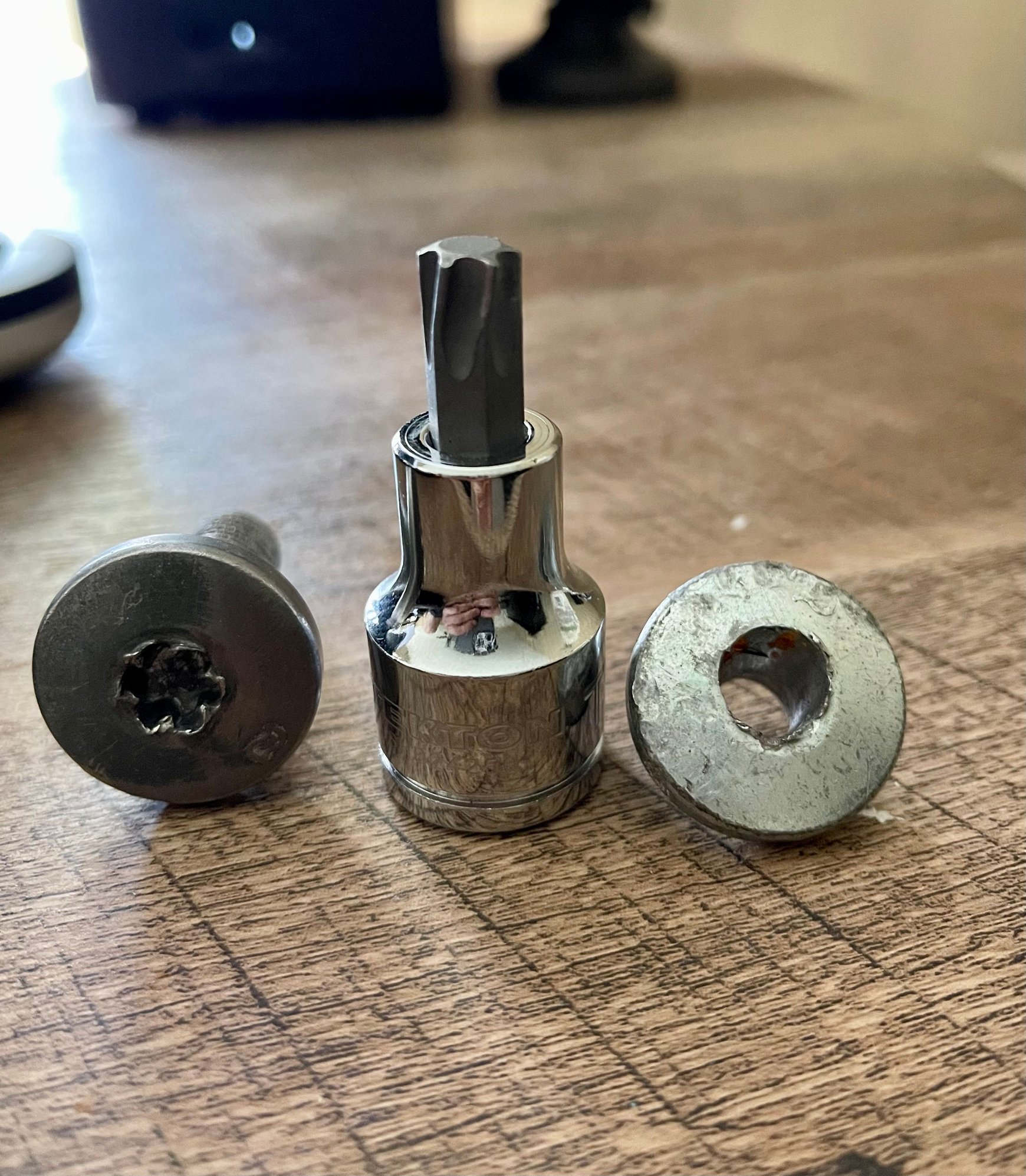 As you can see in the photo I twisted a 1/2 inch drive T50 before drilling through the head of the bolt. I think I used a 3/8ths to drill through it but it ended up just falling out about a quarter of the way through. It’s necessary to remove the seat whether you drill it, cut the head off, or break it loose because you’ll want full access to the hole with no obstructions from the seat bracket. Make sure you’re drilling as straight as possible, you’ll be boring the hole out but you don’t want to go completely sideways or biffed up because you really only get one shot.