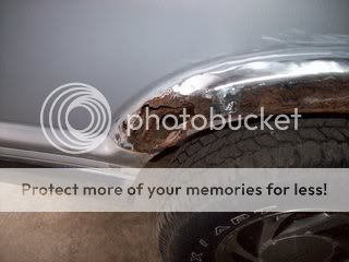 i had a spot like that but only 7" or so long. now i have my rockers and wheel wells covered in bed liner anyway so. i cut out the bad about 1" past on either side and than got a piece of steel stock 1" wide or so and then bought the reinforced fiberglass filler and rebuilt it. i bent the steel to match the well curve and fastened it to the good portions of panel with self tappers. now i do have a welder but i figured my luck i would warp the panel or burn it up....so i settled. the first layers or so i went heavy on hardener to have set quick so it would stay in place. i then built on that and shaped as i went. i basically have a 7" long chunk of fiberglass in the middle of the wheel well. been that way since last fall no problems. prob not the best way but its working. |
