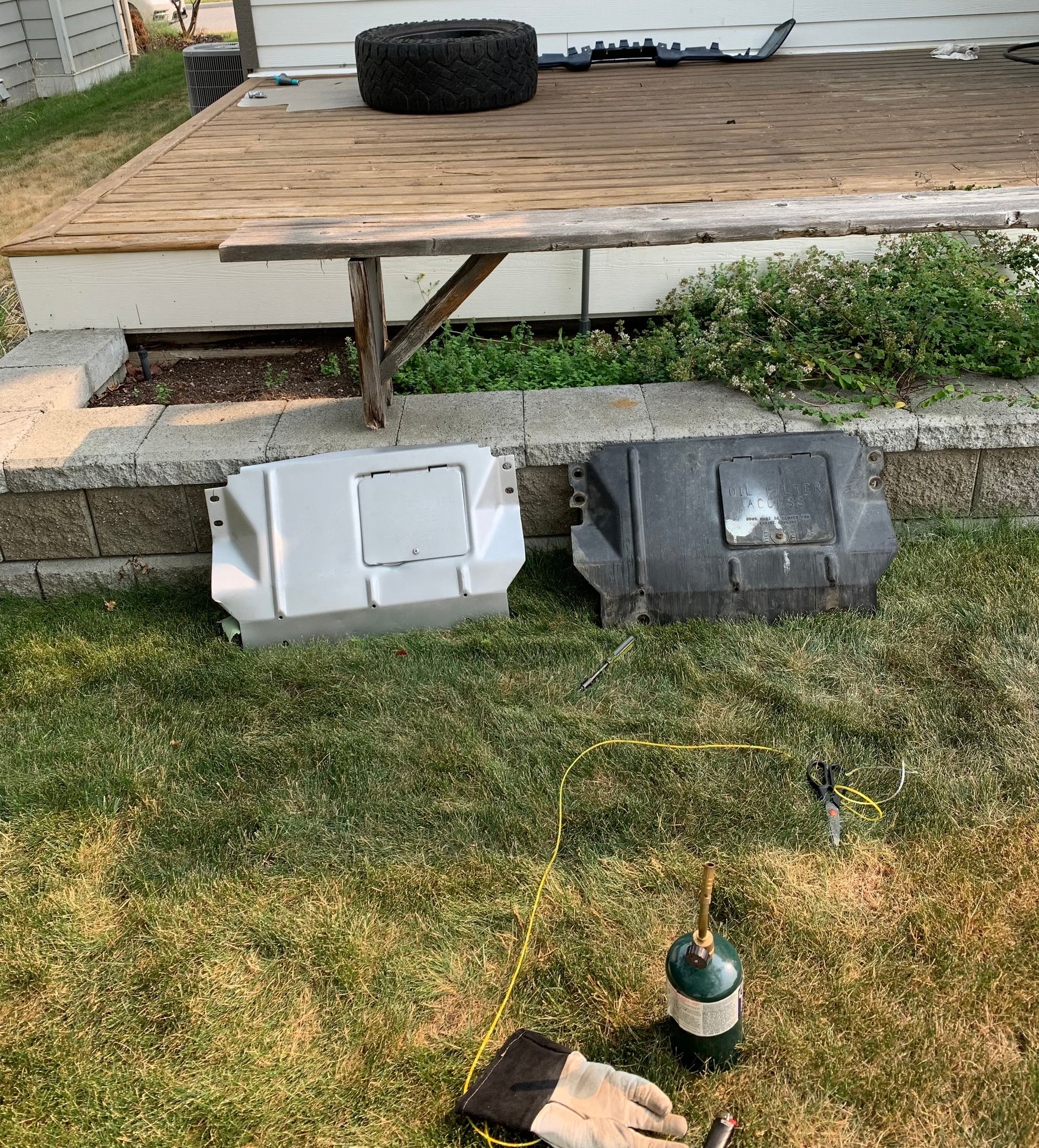 I don't care if the replacement is new or used, or whether it's made of the OEM hard black plastic, aluminum, steel, carbon fiber, etc... I just need something to protect the under-belly from debris. Not planning to do any hard off-roading with the family vehicle.
