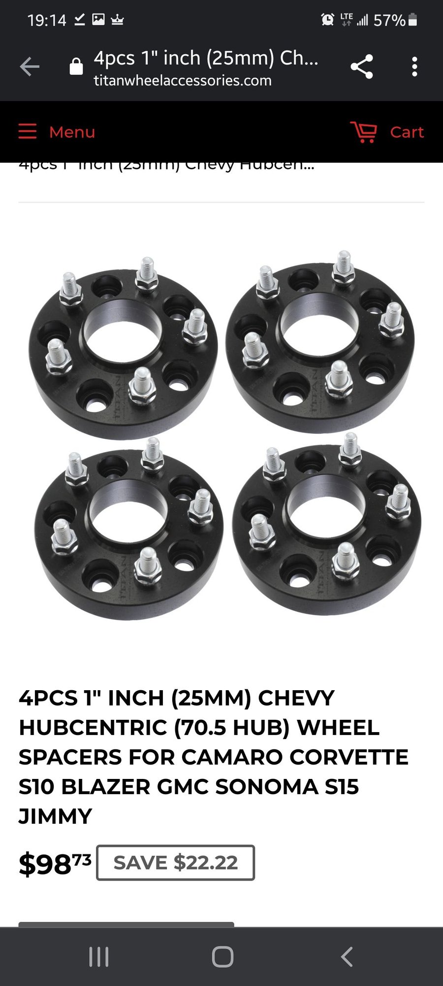 I have a pair of 25mm (or 1 inch) hubcentric wheel spacers off of my 1005 Blazer for sale. There is nothing wrong with them I just decided to take the front spacers off and leave the rears on. These were originally purchased from Titan Wheel Accessories. I would like $50 for them and that will include shipping if needed. They have about 100 miles on them. Pictures are from my recent order and a pic of what they look like. I can provide more if desired. They're still on the truck but it isn't being driven for the next 2 weeks.