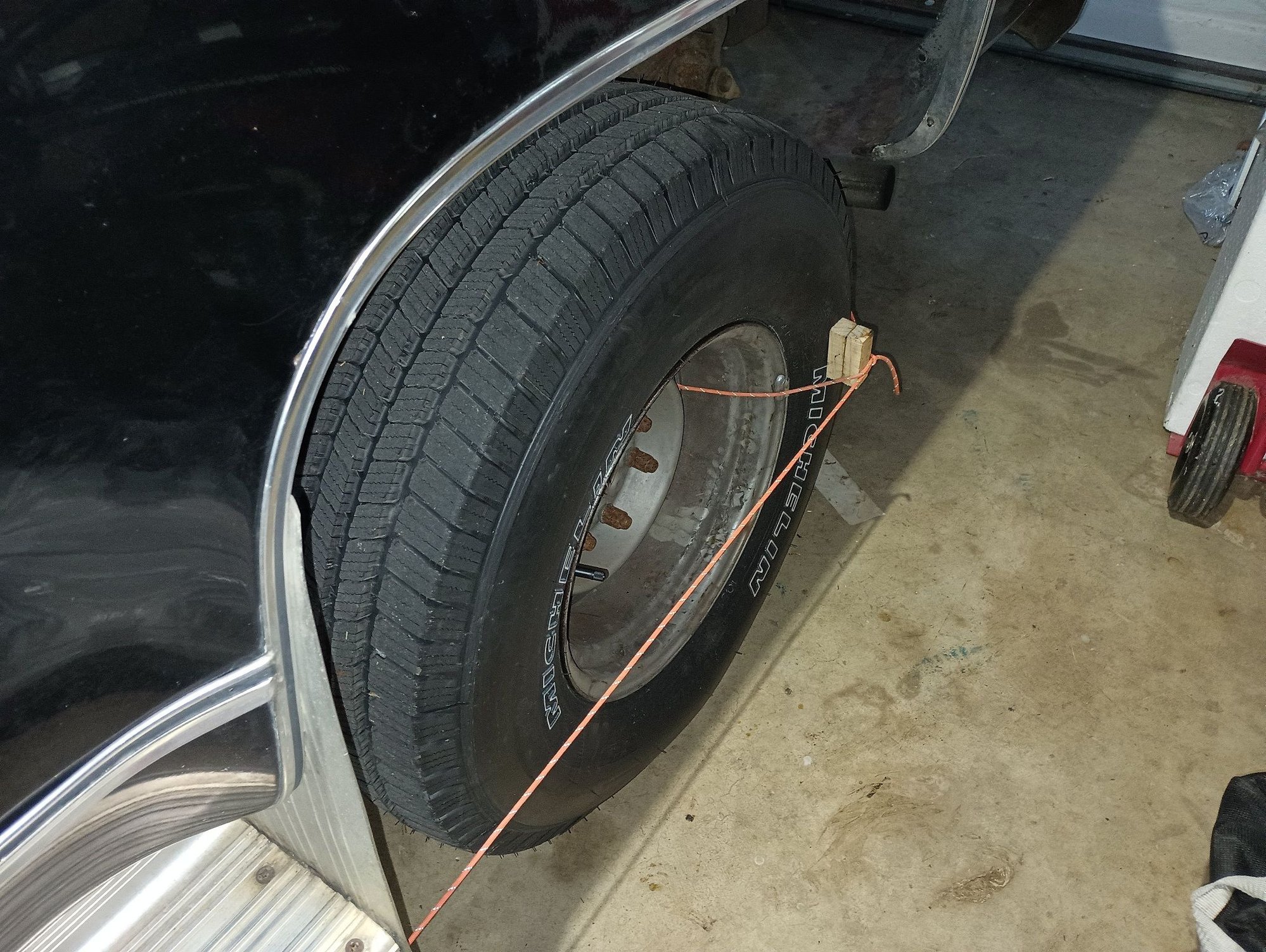 2.) Front wheels are WIDER than the rear so the cord must be spaced away from the rear tire sidewalls about 1-1/2 inch. Wood block at the rear of rear tire. The cord was tied thru the wheel rim. This eliminates one variable and one measurment for more accuracy.
