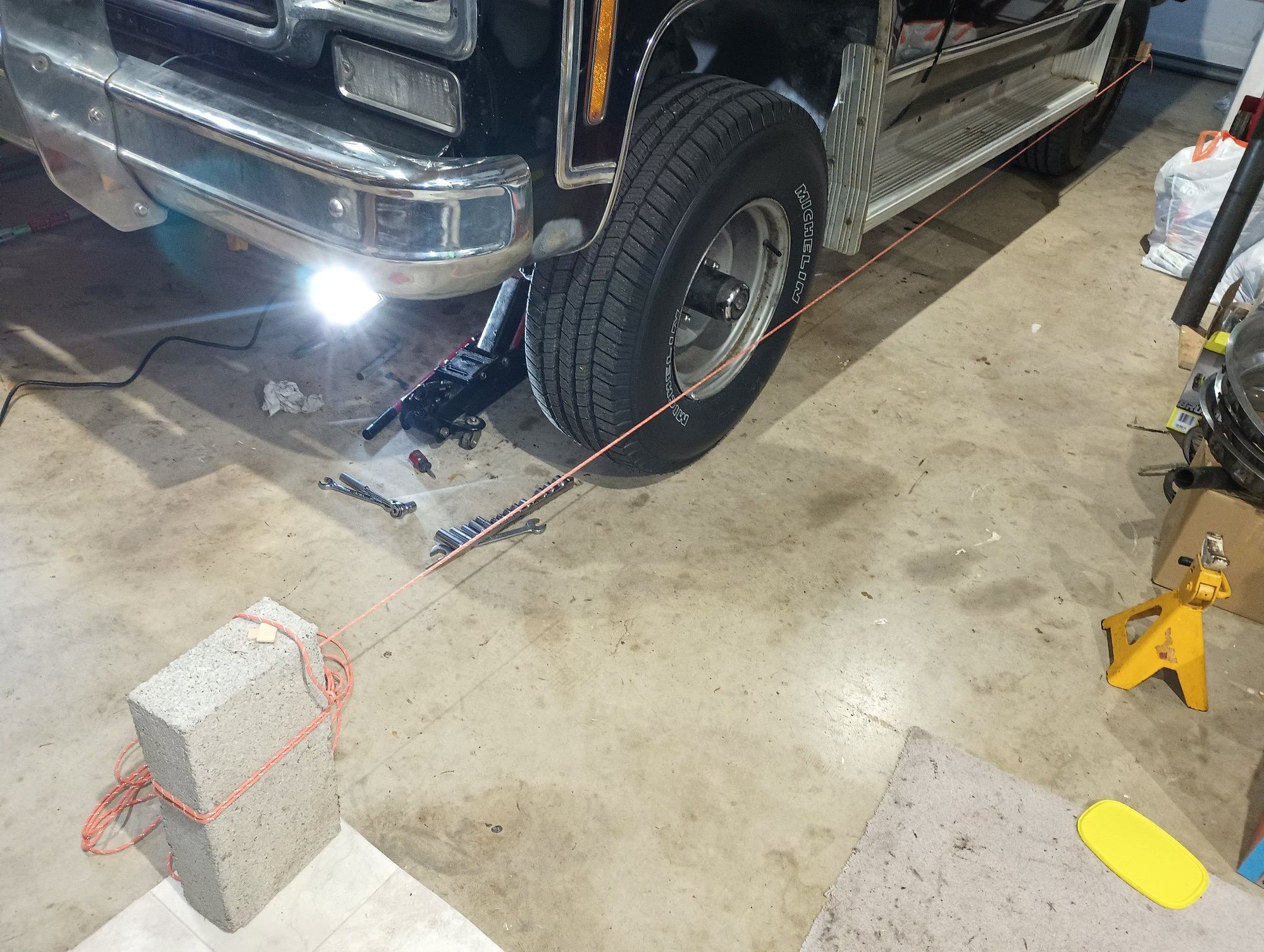 7.) Do the same procedure for the PS with another section of cord, wood spacer and concrete block. Dont remove the DS cord and concrete block yet, thats what (tries to) guarantee that accuracy is transferred from DS to PS! Dont measure alignment from one front wheel across to the other, too inaccuate- its the 10 or so feet of cord from the rear wheel that gives accuracy. Adjust the turnbuckle near the PS front wheel, check steering wheel after each adjustment (or have a helper hold it).