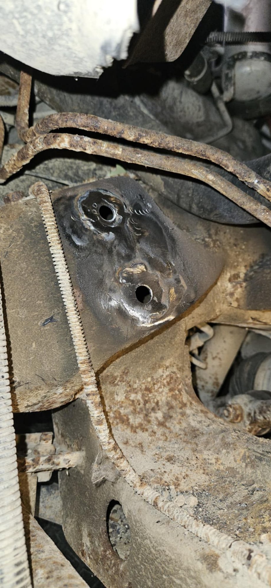 after thinking it about for a while and researching options (possibly doing the 1-ton idler arm upgrade?) I decided that since the holes were almost exactly the right size.. I opened them up just a hair with the die grinder and carbide bit, and welded a 7/16" washer back into the holes, then re-drilled the holes out to fit the metric bolts.
