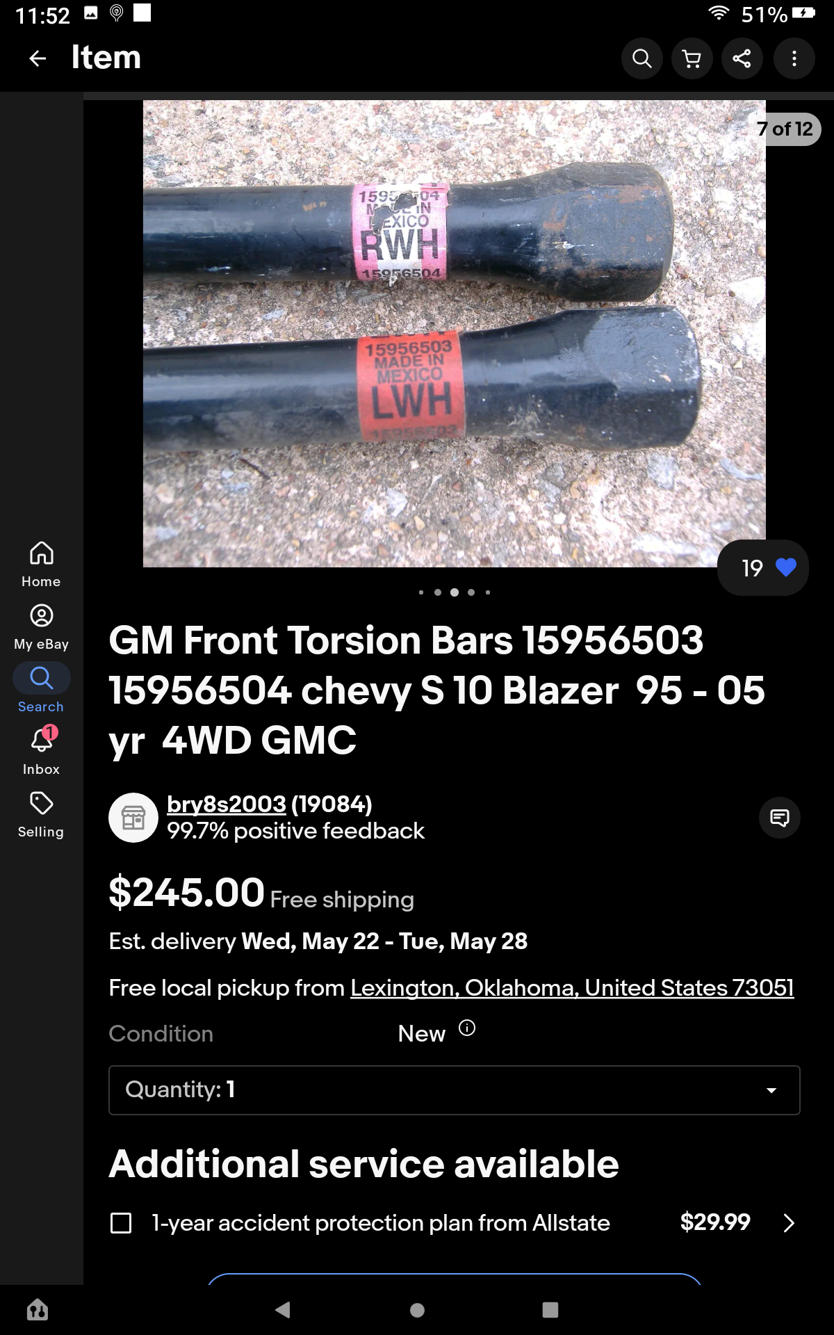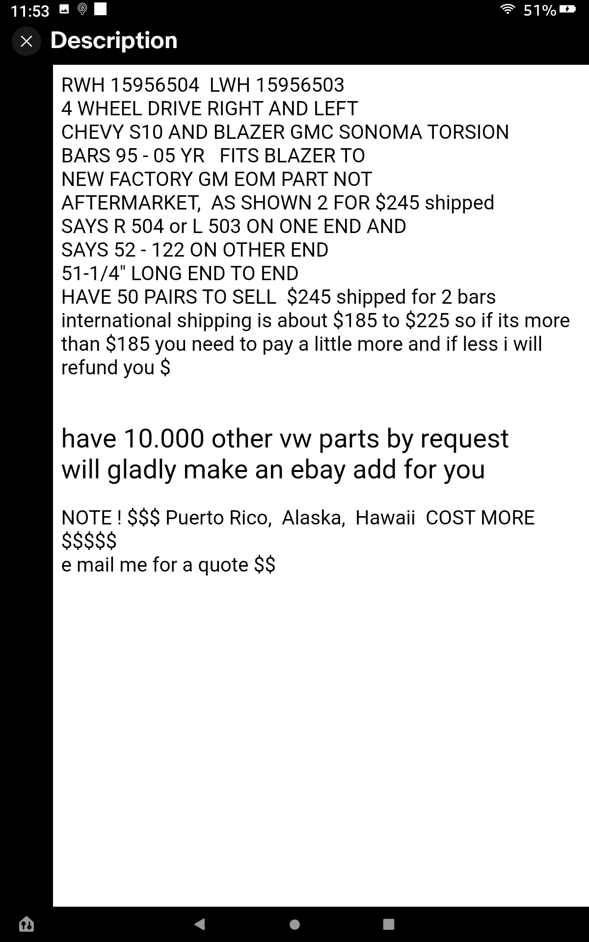 I have been looking for new torsion bars for over four years and I finally found some. This is a once in a lifetime purchase. Once they are gone there gone. I also belong to the s10forum..com and have made a post there about them also,been a member since December 2022 there. I hope this helps anyone looking for this part.