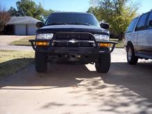 Hunter Truck Accessories stainless bull/light bar; now the company calls themselves Truck Gear Direct. 150w sealed beam KC Daylighters up top, cheapie 100w on the bar, until my next eBay order...