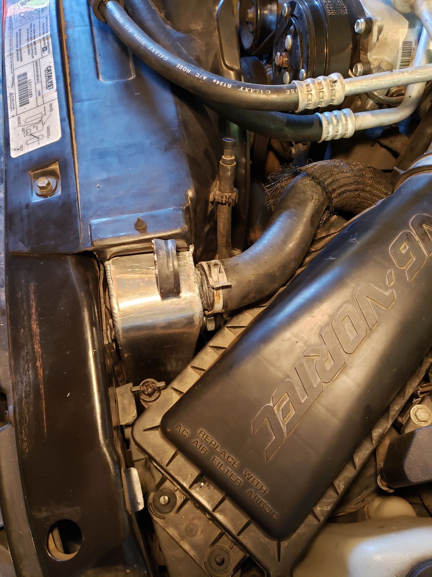 A rasp was used to grind away some of the ribs on the side of the air filter box that were touching the upper radiator hose.