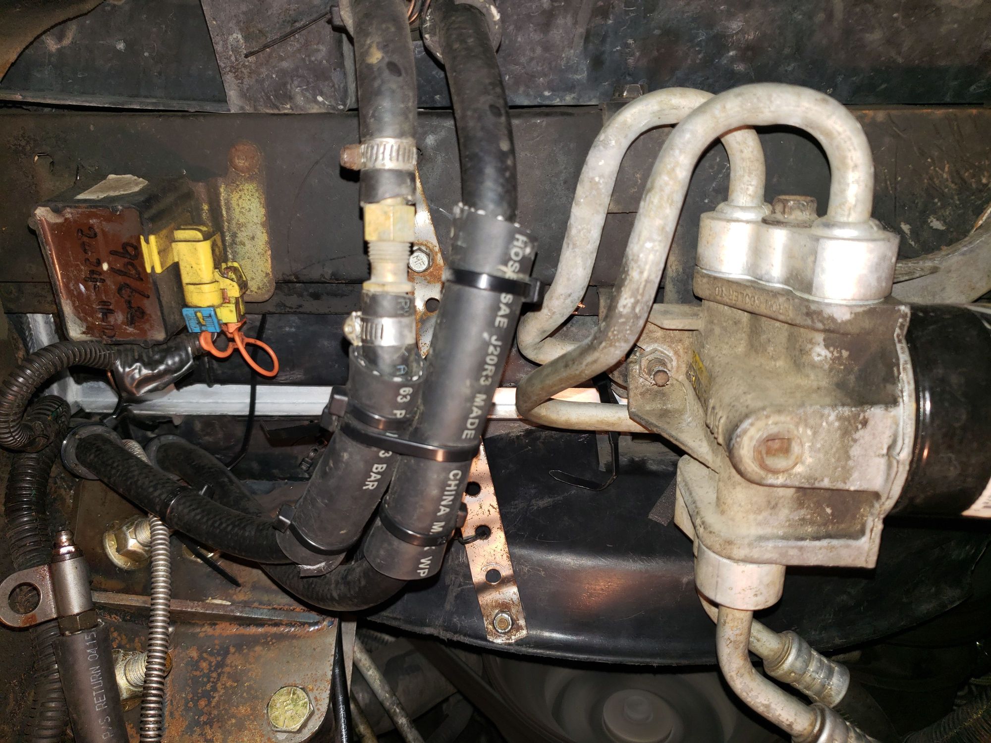View from below showing my supplemental transmission cooler lines. In the far left of the radiator you can see where I used a zip tie to secure the bottom fan shroud to the bottom of the radiator using a hole in the radiator frame, I did this at the center and on the driver side. too.